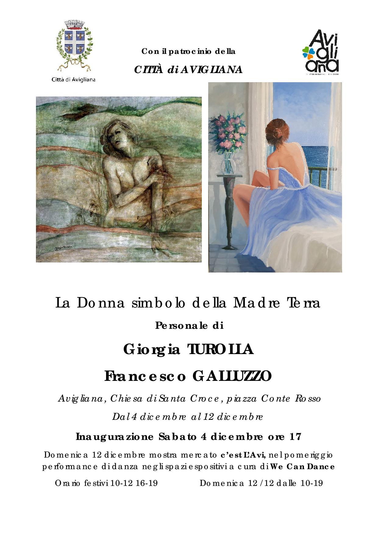 La mostra mostra personale di Giorgia Turolla e Francesco Galluzzo La donna simbolo della madre Terra sarà inaugurata sabato 4 dicembre alle 17 alla chiesa di Santa Croce. Si potrà vedere fino al 12 dicembre nei festivi con orario 10-12 e 16-19 e nella giornata di domenica 12 con orario continuato 10-19.