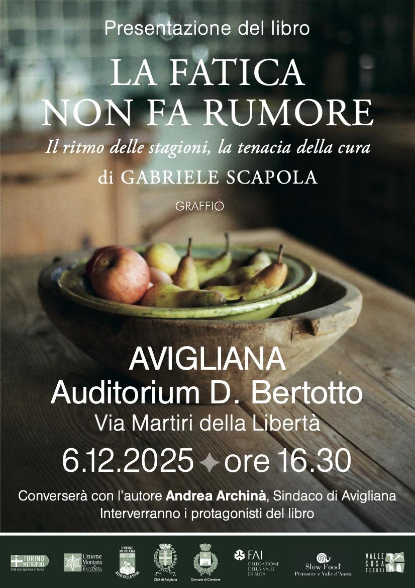 Il volume, che sarà presentato all’auditorium Daniele Bertotto sabato 6 dicembre 2025 alle 16,30, è un invito a superare gli stereotipi turistici e a vedere le piccole comunità locali come spazi di una nuova cultura condivisa. Nel corso dell’incontro converserà con l’autore il sindaco Andrea Archinà. La presentazione ha ottenuto il patrocinio di Comune di Avigliana, Comune di Condove, Unione montana Valle Susa e Alta Valle Susa, Città metropolitana di Torino, Fai, Slow food Piemonte e Valle d’Aosta, Valle di Susa tesori di arte e cultura alpina. Il libro sarà presentato prossimamente all’Ambasciata italiana a Copenaghen.