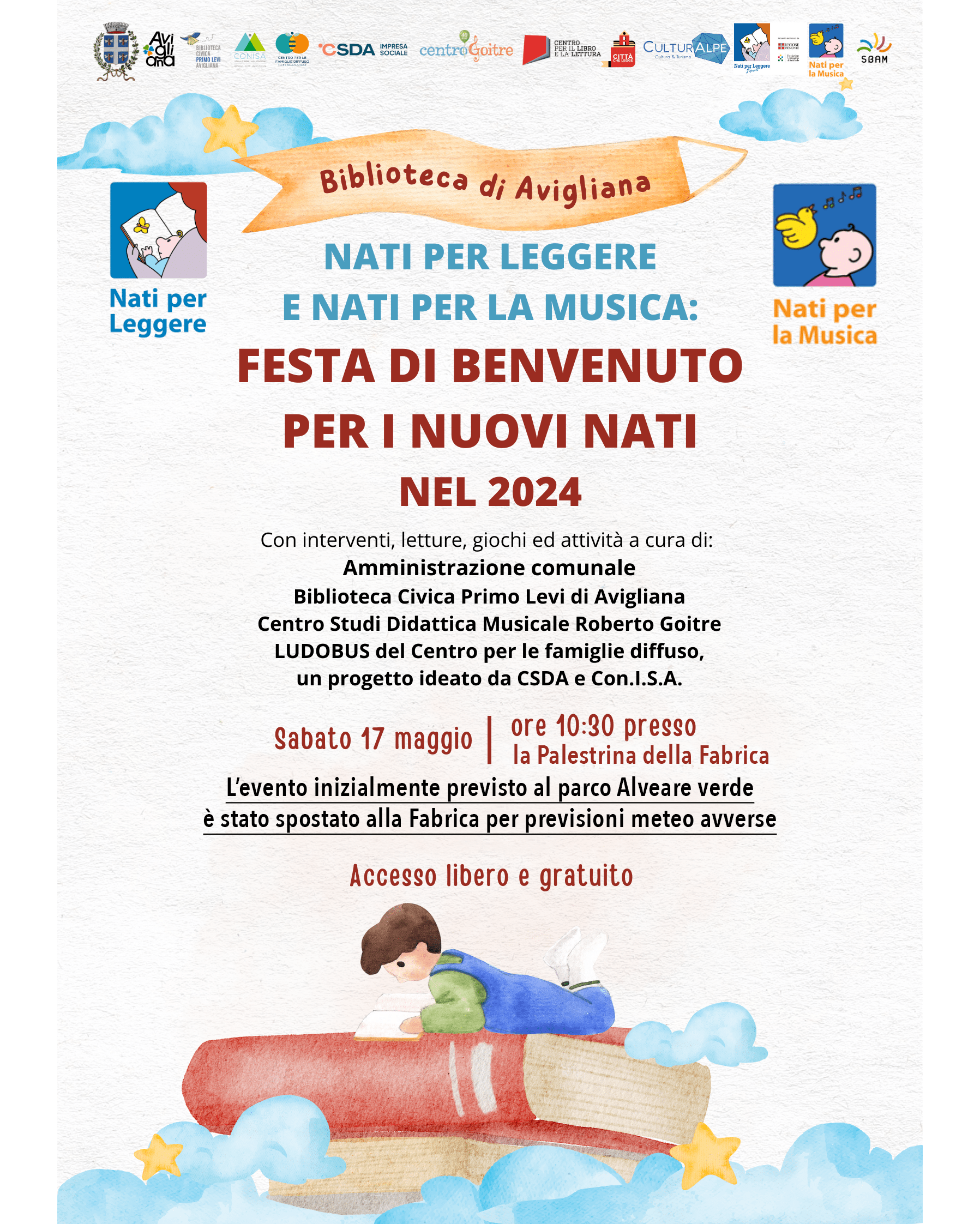 Avigliana, 16 maggio 2025 – I genitori dei bambini e delle bambine nate nel 2024 sono invitati alla Festa di benvenuto che si terrà sabato 17 maggio 2025 alle 10,30, alla palestrina del centro La Fabrica (e non più al parco Alveare verde come annunciato in precedenza). I progetti Nati per Leggere e Nati per la Musica sono sostenuti dall’Associazione culturale pediatri, dall’Associazione italiana biblioteche e dal Centro per la salute del bambino e pensati appositamente per le famiglie con bambini neonati, per creare occasioni in cui far conoscere libri, letture e musica adatti all’età dei bambini e delle bambine. Il suono della voce rassicurante dei genitori, durante la lettura o il canto, intensifica il legame indissolubile tra neonati e genitori. L’incoraggiamento alla lettura e alla musica fin dalla prima infanzia si configura come un valido strumento per favorire il benessere e il completo sviluppo dei bambini, soprattutto nei primi tre anni di vita.