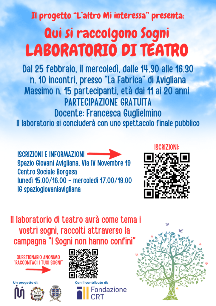 Hai tra gli 11 e i 20 anni e hai voglia di metterti in gioco? All’interno del progetto “L’altro mi interessa”, apre il nuovo laboratorio teatrale: “Qui si raccolgono sogni”. Il laboratorio non sarà solo un corso di recitazione, ma un viaggio creativo che avrà come tema i sogni raccolti attraverso la campagna “I sogni non hanno confini”. Il percorso si concluderà con uno spettacolo finale pubblico. Quando: ogni mercoledì, a partire dal 25 febbraio. Orario: Dalle 14,30 alle 16,30. Durata: 10 incontri totali. Dove: Presso “La Fabrica” di Avigliana. Docente: Francesca Guglielmino.La partecipazione è completamente gratuita. Attenzione: I posti sono limitati a un massimo di 15 partecipanti. Puoi iscriverti – entro il 10 febbraio – inquadrando il QR code presente sul volantino oppure di persona presso lo Spazio giovani Avigliana. Indirizzo: via IV Novembre 19 (Centro Sociale Borgesa). Orari sportello: lunedì: 15-16 e mercoledì: 17-19. Social: Instagram @spaziogiovaniavigliana. Vuoi contribuire con le tue idee? Puoi partecipare anche compilando il questionario anonimo “Raccontaci i tuoi sogni” tramite il QR code dedicato sul materiale informativo.