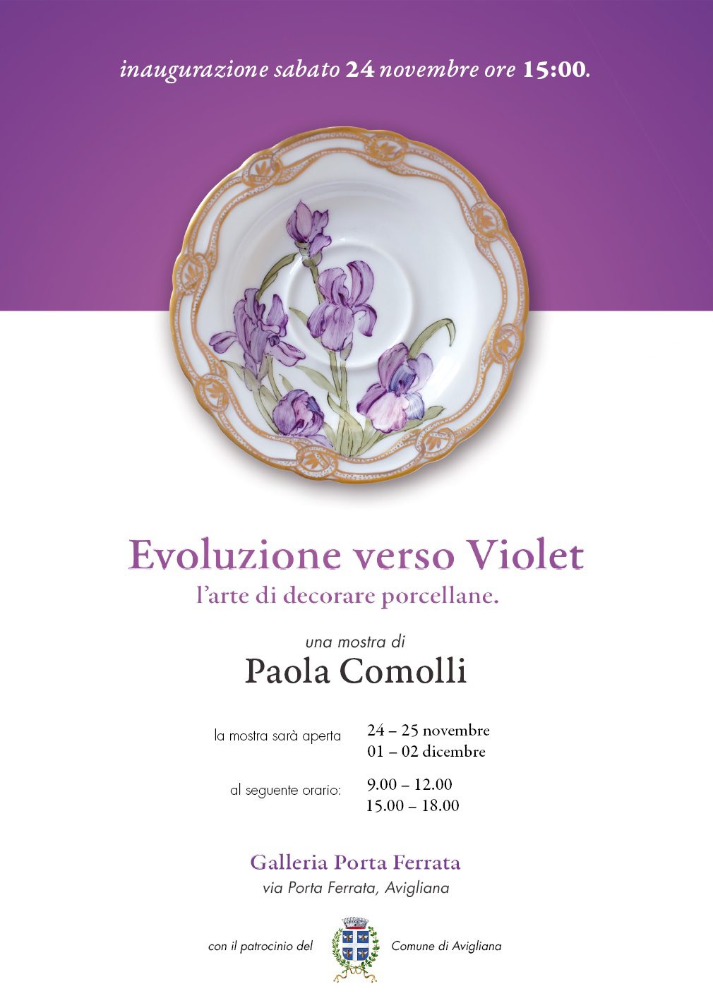 “Evoluzione verso Violet, l’arte di decorare porcellane” è la mostra di Paola Comolli aperta il 24-25 novembre e il 1-2 dicembre 2018 alla Galleria di Porta ferrata