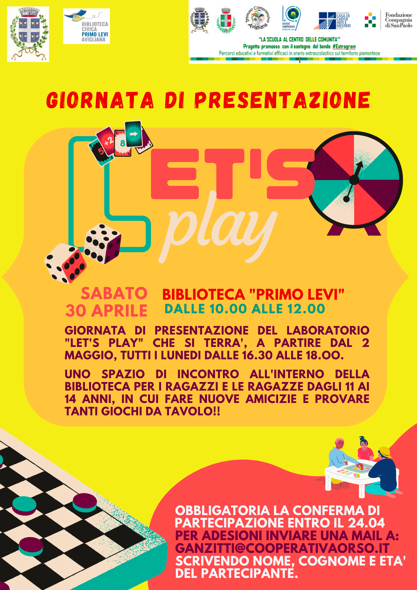 Sabato 30 aprile alla biblioteca Primo Levi dalle 10 alle 12 si svolgerà la giornata di presentazione del laboratorio Let’s play che si terrà a partire dal 2 maggio, tutti i lunedì dalle 16,30 alle 18. Uno spazio di incontro all’interno della biblioteca per i ragazzi e le ragazze dagli 11 al 14 anni, in cui fare nuove amicizie e provare tanti giochi da tavolo.