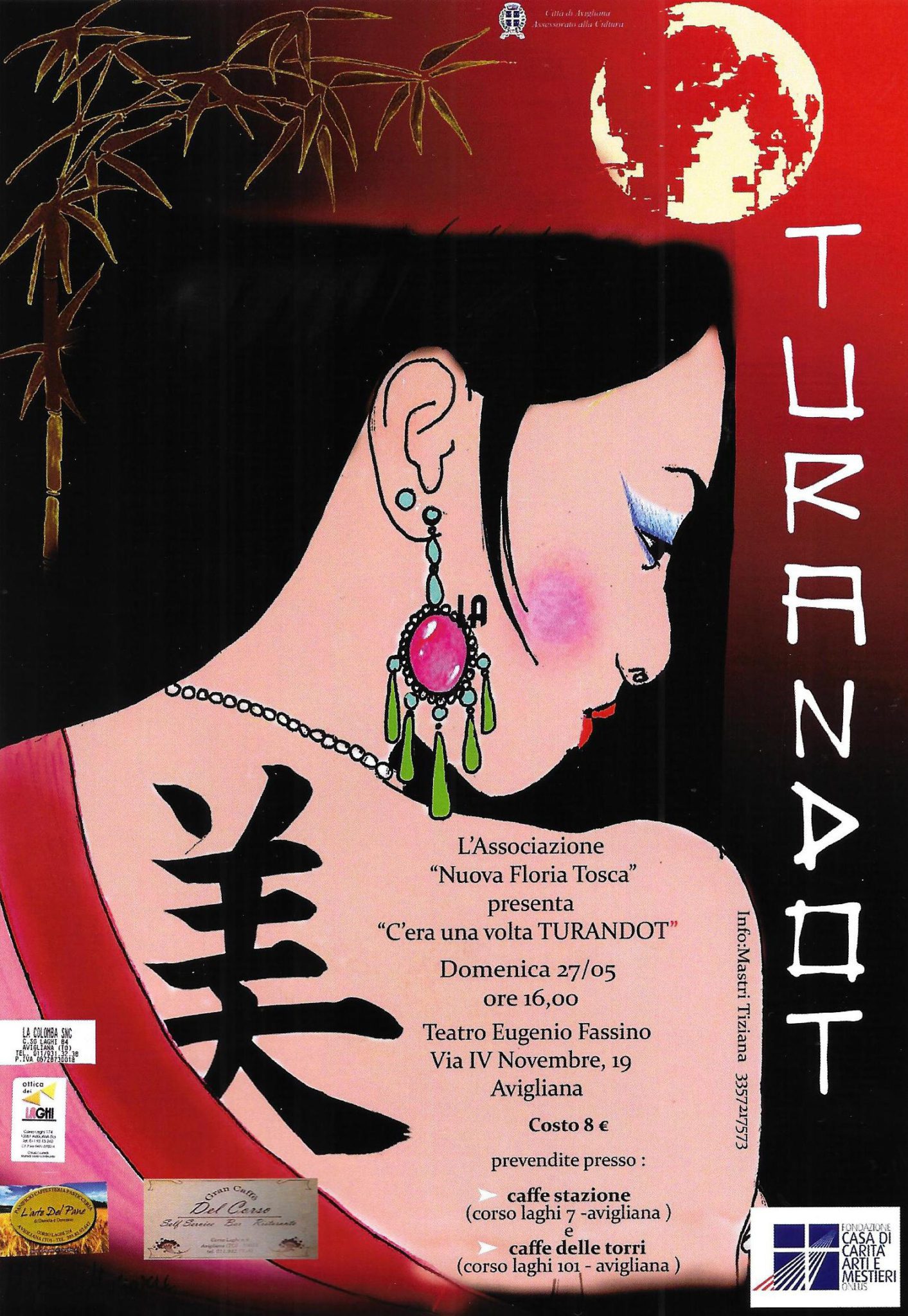 Domenica 27 maggio 2018 alle ore 16 al Teatro Fassino l’associazione Nuova Floria Tosca mette in scena lo spettacolo patrocinato dal Comune di Avigliana “C’era una volta Turandot” con Tiziana Mastri, Loretta Borrelli, Ludo Farago, conduttrice Fulvia Roggero, maestro accompagnatore Luigi Canestro. Per ulteriori informazioni Tiziana Mastri 3357217573. Costo del biglietto 8 euro, prevendite presso il Caffè Stazione e il Caffè delle Torri.