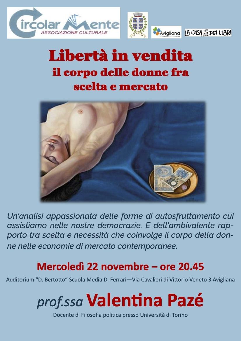 Avigliana, 13 novembre 2023 – Mercoledì 22 novembre 2023 nei locali dell’auditorium Daniele Bertotto, alle 20,45 inizierà la terza tappa del programma dell’associazione culturale Circolarmente di Avigliana dedicato quest’anno al tema: Libertà e dintorni. Sarà ospite degli incontri di Circolarmente la professoressa Valentina Pazé, docente di Filosofia politica presso l’Università di Torino. «La professoressa – spiegano gli organizzatori – è autrice del saggio “Libertà in vendita, il corpo tra scelta e mercato” edito da Bollati Boringhieri. Affronterà, come è suo solito in maniera appassionata e rigorosa l’analisi di alcune forme di sfruttamento a cui assistiamo con crescente imbarazzo nelle nostre democrazie». L’iniziativa si svolge con il patrocinio del Comune di Avigliana e con la partecipazione della Casa dei Libri, che è sempre di più un punto di riferimento per molti concittadini amanti della lettura.