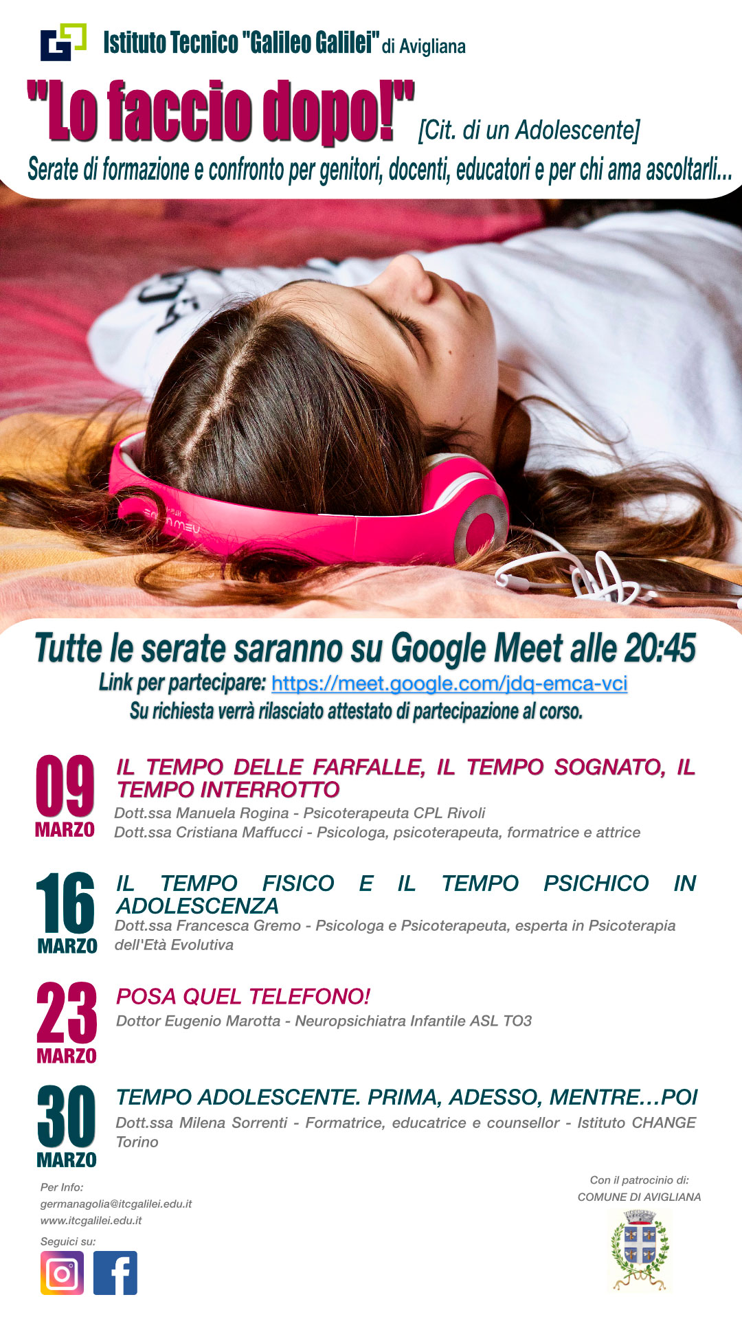 Anche quest’anno l’Istituto tecnico Galileo Galilei, ha organizzato con il patrocinio del Comune di Avigliana un ciclo di incontri serali, dedicati a genitori, insegnanti, educatori e a quanti vivono quotidianamente la realtà adolescenziale al fianco di figli e alunni. L’obiettivo è quello di perseguire la comunicazione tra la scuola e la famiglia, gli incontri si svolgeranno tutti i mercoledì di marzo a partire dal 9 e fino al 30 alle 20,45. Le serate si terranno tutte sulla piattaforma Meet, non sarà necessaria l’iscrizione, neanche per i docenti di altre scuole.