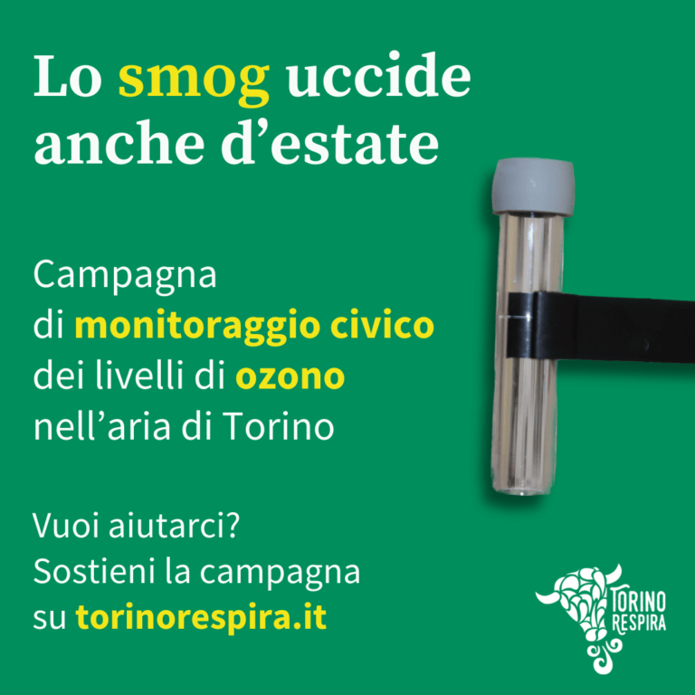 A Torino esistono solamente due stazioni fisse per la misurazione dell’ozono. Con la campagna “Lo smog uccide anche d’estate” il comitato Torino respira vuole raccogliere dati in altri luoghi nei quali i cittadini e le cittadine trascorrono una parte del loro tempo libero d’estate, come parchi e giardini pubblici, per capire meglio a quali rischi per la salute sono esposti. A Torino saranno studiati almeno 50 punti in città per cominciare a costruire una mappa e a sensibilizzare la cittadinanza e l’amministrazione pubblica.