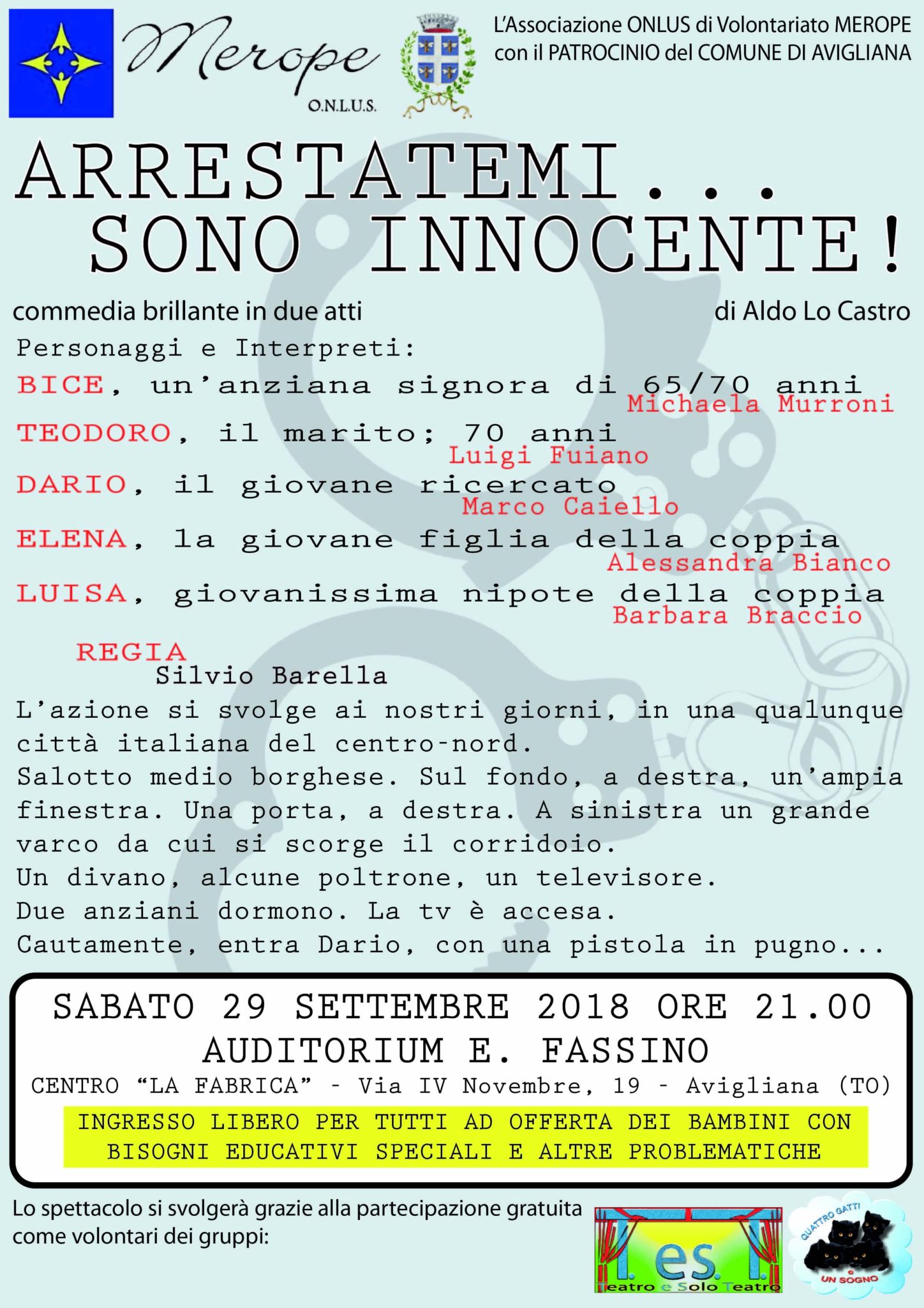 Sabato 29 settembre al teatro Fassino “Arrestatemi… sono innocente” di Aldo Lo Castro, commedia brillante in due atti. Commedia proposta da Merope Onlus