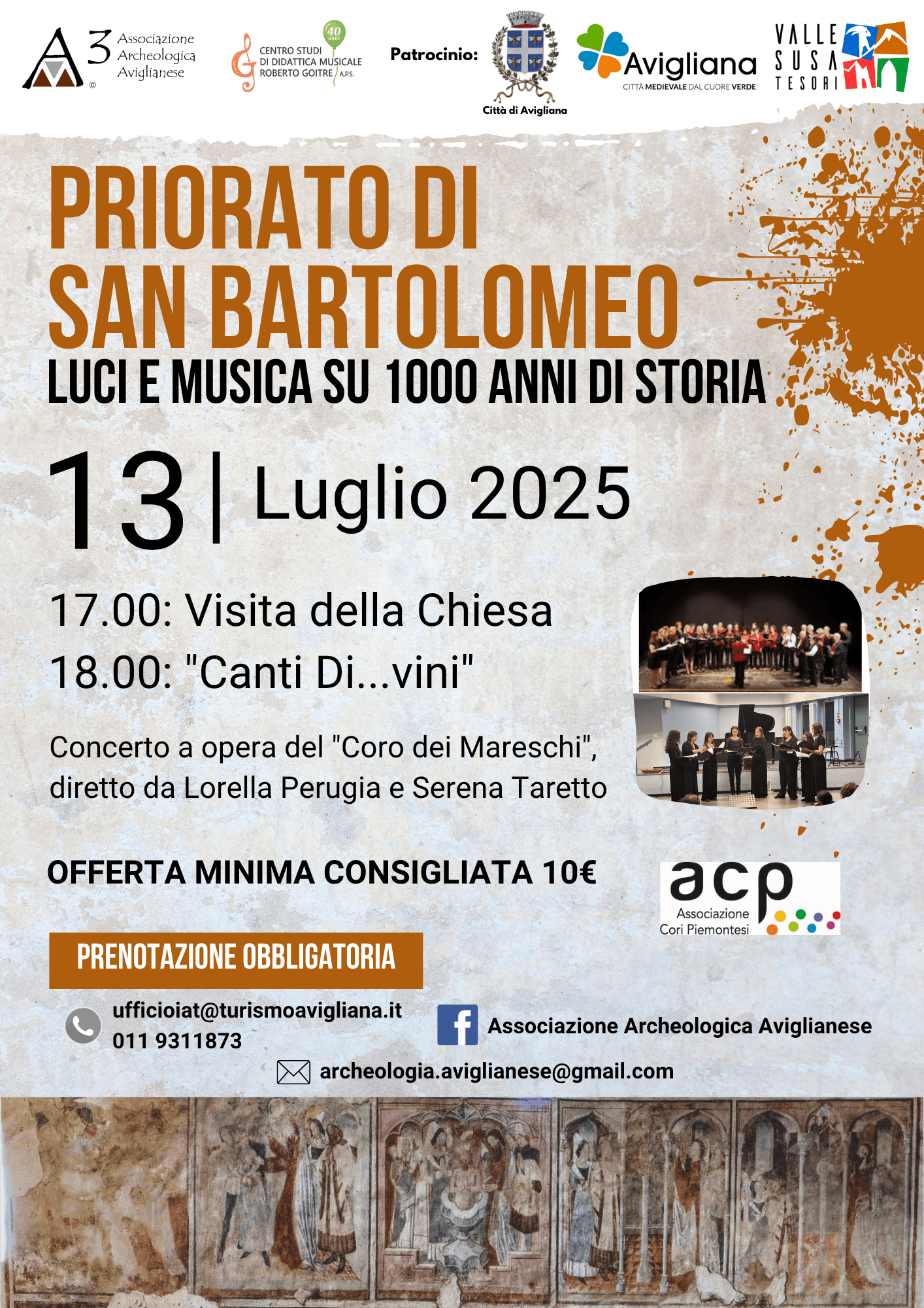 Avigliana, 4 luglio 2025 – Domenica 13 luglio 2025 alle 17 l’associazione A3 organizza una visita speciale al priorato di San Bartolomeo, che condurrà i partecipanti attraverso dieci secoli di storia, segreti e bellezze artistiche. A seguire, alle 18, spazio alla musica con il concerto “Canti di…vini” dei Cori “Le Voci dei Mareschi” e dell’Ensemble giovanile del Centro Goitre”, diretti da Lorella Perugia e Serena Taretto, in collaborazione con il Centro Studi di didattica musicale Goitre e l’associazione regionale Cori piemontesi. Il concerto attraverserà generi e secoli diversi, legati dal sapore del vino e dal gusto per la festa.