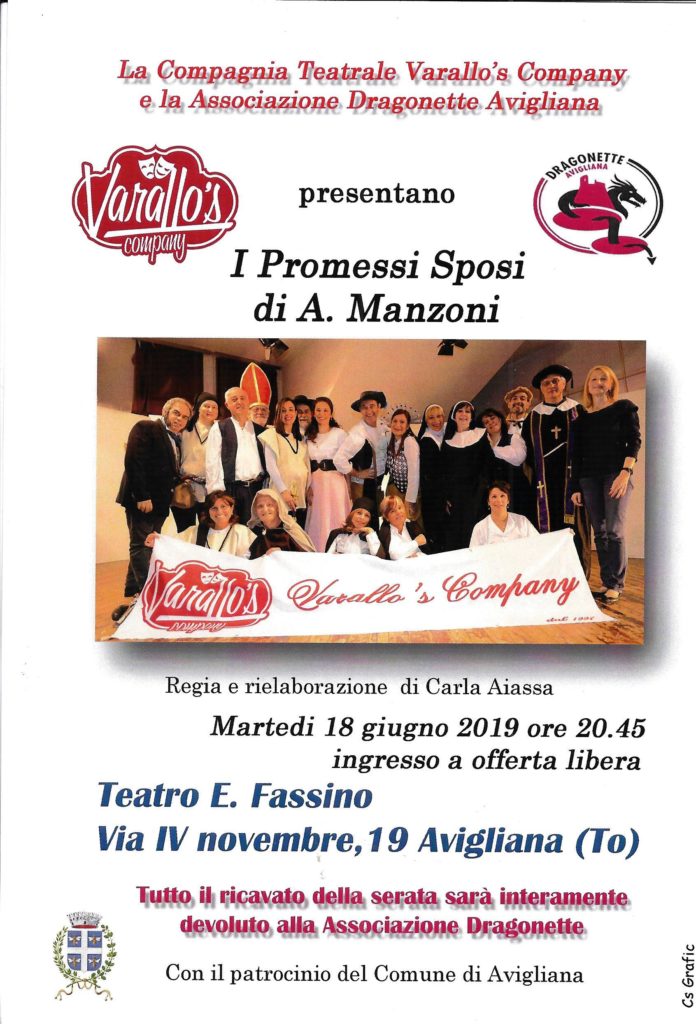La compagnia teatrale Varallo’s company e l’associazione Dragonette Avigliana presentano “I promessi sposi” di Alessandro Manzoni con la regia e la rielaborazione di Carla Aisassa. Lo spettacolo va in scena al teatro Eugenio Fassino martedì 18 giugno alle 20,45 con ingresso a offerta libera. Il ricavato della serata è devoluto interamente all’associazione Dragonette.