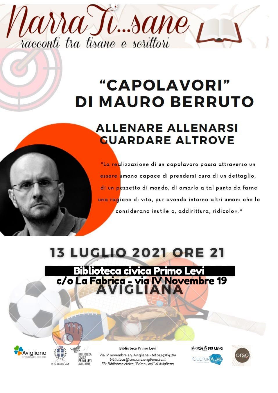 L’allenatore e scrittore Mauro Berruto presenta il suo nuovo libro “Capolavori” in biblioteca martedì 13 luglio alle 21 nell’ambito della rassegna Narra Ti…sane della biblioteca civica Primo Levi, in collaborazione con Casa dei Libri, Orso, Culturalpe e con il patrocinio del Comune di Avigliana
