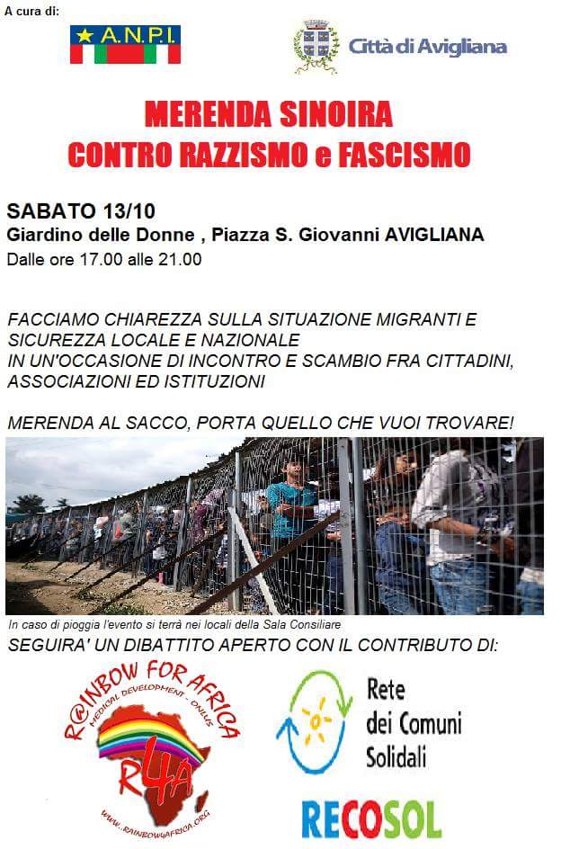 L’Anpi Avigliana, con il patrocinio dell’Amministrazione comunale, organizza sabato 13 ottobre, una giornata di riflessione sui temi dell’immigrazione e della sicurezza. Parteciperanno le associazioni Re.Co.Sol – rete dei Comuni Solidali e Rainbow for Africa che sul nostro territorio sono impegnate per il sostegno e l’accoglienza ai migranti. L’evento si svolgerà sabato 13 ottobre presso il Giardino delle donne in piazza Conte Rosso ad Avigliana (in caso di maltempo nella Sala consiliare) dalle ore 17 alle ore 20. I cittadini sono invitati a partecipare portando il proprio contributo.
