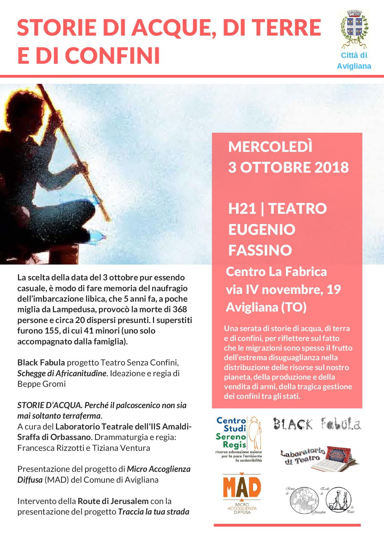 Mercoledì 3 ottobre 2018 alle ore 21 al teatro Eugenio Fassino, una serata di storie di acqua, di terra e di confini per riflettere sul fatto che le migrazioni sono spesso il frutto dell’estrema disuguaglianza nella distribuzione delle risorse sul nostro pianeta, della produzione e della vendita di armi, della tragica gestione dei confini tra gli Stati.