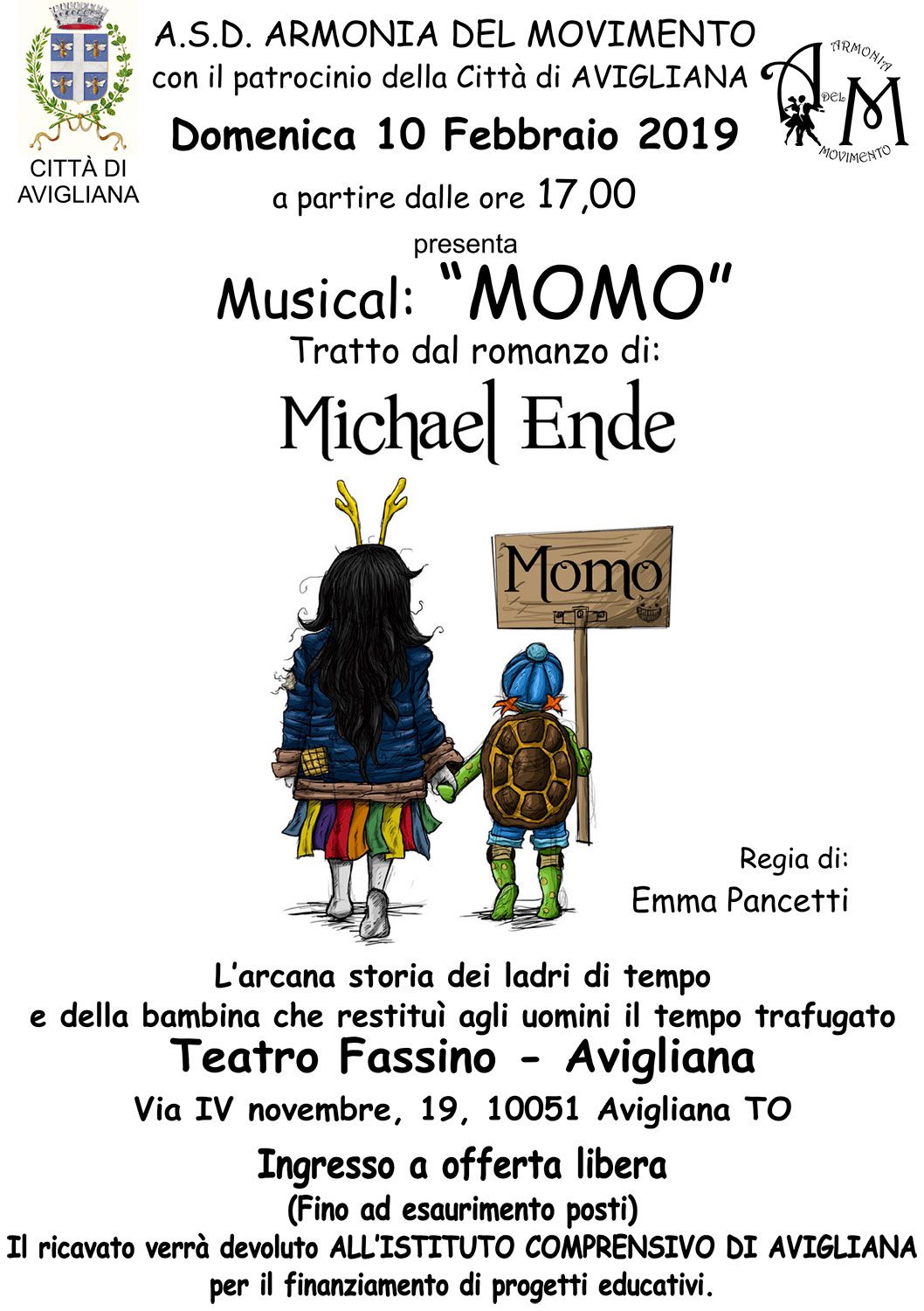 Al Fassino, domenica 10 febbraio 2019 a partire dalle ore 17, va in scena il musical Momo. Ingresso a offerta libera con ricavato devoluto all’Istituto Comprensivo di Avigliana
