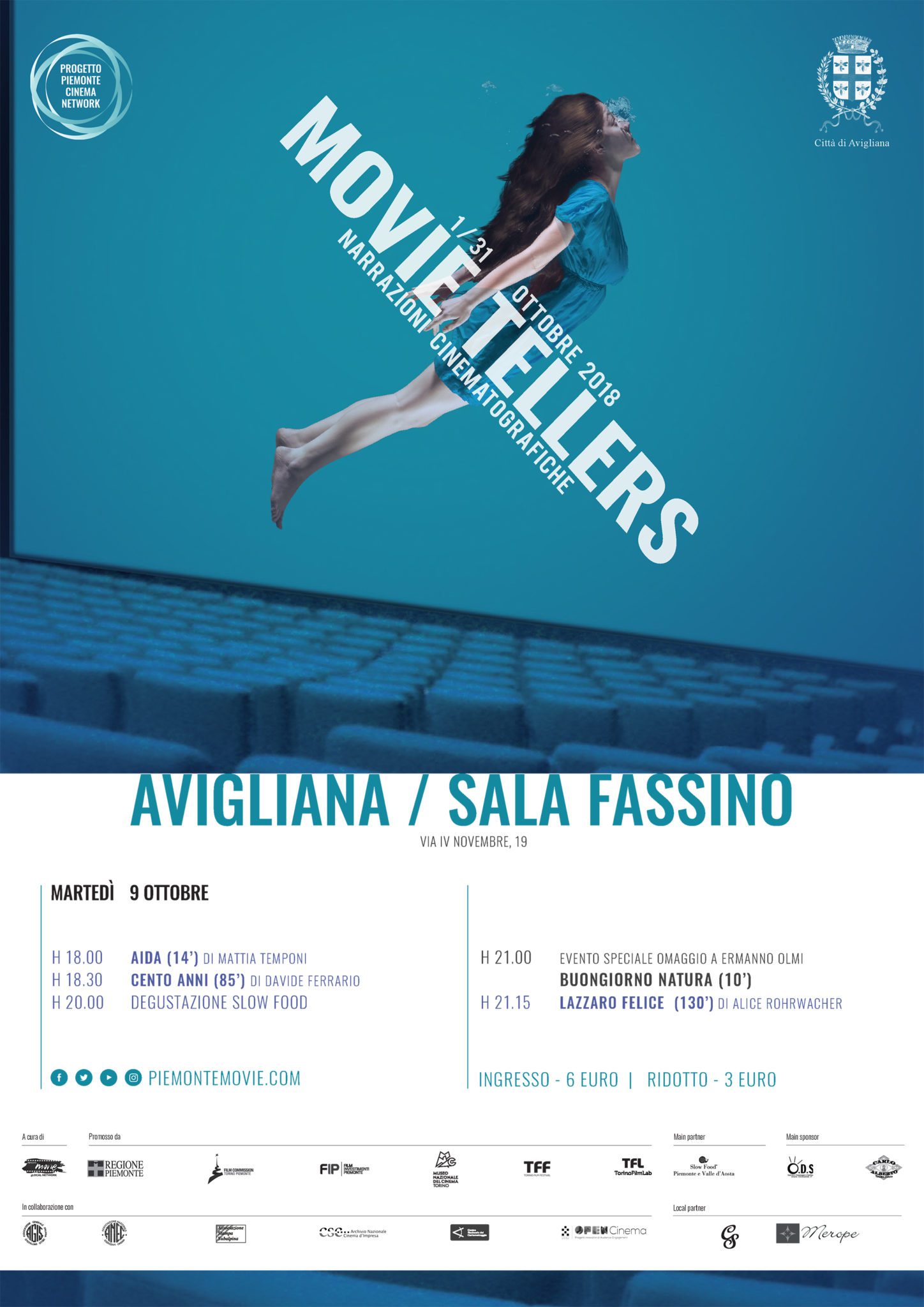 Ad Avigliana la manifestazione si terrà martedì 9 ottobre al teatro Eugenio Fassino con la proiezione del cortometraggio di Mattia Temponi “Aida” alle ore 18, a seguire “Cento anni” di Davide Ferrario. Alle ore 20 degustazione Slow food e alle 21 evento speciale, omaggio al regista Ermanno Olmi, recentemente scomparso, “Buongiorno natura”. La giornata si conclude con la proiezione di “Lazzaro felice” di Alice Rohrwacher a partire dalle 21,15. Il costo dell’ingresso è di 6 euro, ridotto 3.