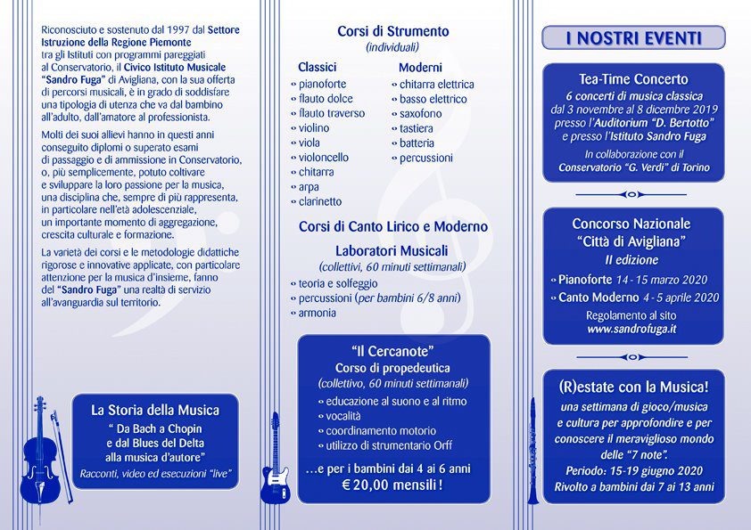 Saranno organizzati corsi di Storia della Musica in forma di concerto con l’ausilio di racconti, video ed esecuzioni dal vivo. Saranno presenti inoltre corsi collettivi di propedeutica, corsi di teoria e solfeggio, e, come negli anni passati, al prezzo promozionale di 20 euro un corso chiamato “Il cercanote junior”riservato ai bambini dai 4 ai 6 anni. Nella primavera 2020 sarà istituita la II edizione del Concorso nazionale Città di Avigliana riservato al pianoforte e al canto moderno (informazioni da ottobre al sito www.sandrofuga.it).