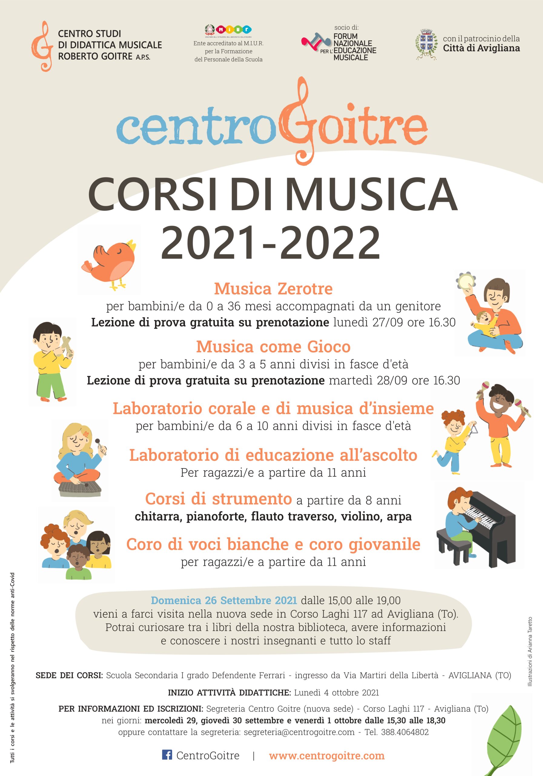 Il Goitre attiverà anche quest’anno tutti i corsi per bambini e ragazzi da 0 a 16 anni che saranno tenuti da docenti specializzati nella didattica musicale e in continuo aggiornamento. Tutti i corsi si svolgeranno nel rispetto delle norme anti-Covid. È prevista una lezione di prova gratuita per i corsi di Musica zerotre, per bambini da 0 a 36 mesi, accompagnati da un genitore lunedi 27 Settembre e per il corso Musica come gioco per bambini da 3 a 5 anni martedì 28settembre. Per partecipare è necessario iscriversi inviando una mail a segreteria@centrogoitre.com indicando nome e cognome del bambino e età.