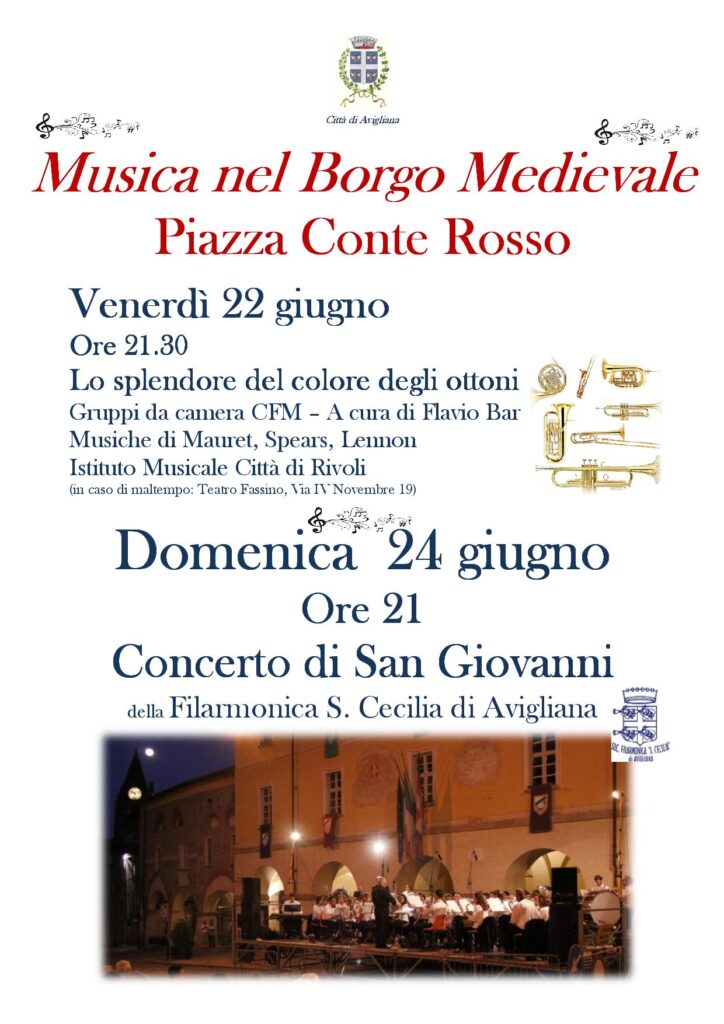 Domenica 24 alle ore 21 si svolge invece un altro evento musicale: il concerto della Filarmonica Santa Cecilia di Avigliana per festeggiare San Giovanni, festa del santo patrono.