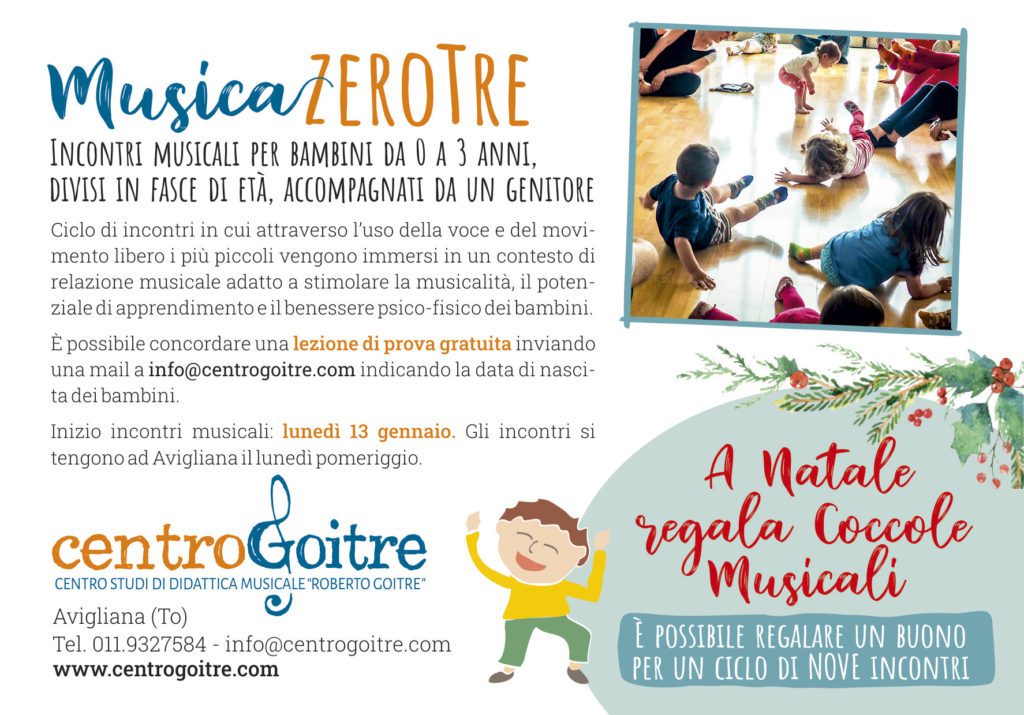 L’associazione aviglianese impegnata da oltre trent’anni nel campo della didattica musicale per bambini e ragazzi attiva ogni anno corsi di educazione musicale nella sede di Avigliana. Tra i corsi che è possibile frequentare il corso Musica zerotre è rivolto a neonati e bambini da 0 a 36 mesi, divisi in fasce di età, accompagnati da un genitore o una figura affettiva di riferimento. Si tratta di incontri musicali in cui attraverso l’uso della voce e del movimento libero i più piccoli vengono immersi in un contesto di relazione musicale adatto a stimolare la musicalità, il potenziale di apprendimento e il benessere psico fisico del bambino. Il secondo ciclo di 9 incontri partirà lunedì 13 gennaio ed è possibile concordare una lezione di prova gratuita inviando una mail a info@centrogoitre.com indicando la data di nascita del bambino. Per chi è alla ricerca di un’idea regalo originale per Natale è possibile regalare un buono per l’intero ciclo di incontri. È possibile acquistare il buono recandosi presso la segreteria del Centro Goitre in piazza del Popolo 2/D tutti i martedì e mercoledì dalle 15,30 alle 18,30.
