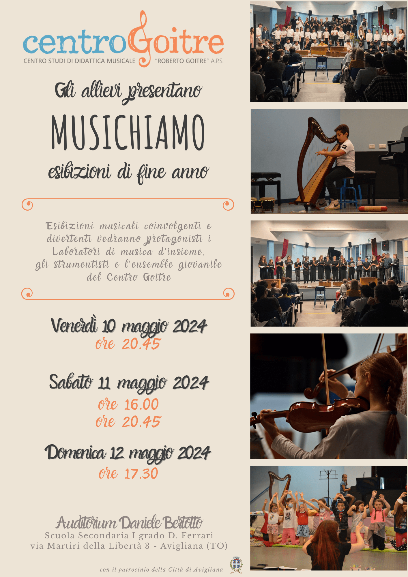 Avigliana, 9 maggio 2024 – Fine settimana di saggi di fine anno al Centro Goitre, l’associazione aviglianese che da quarant’anni è attiva nel mondo dell’educazione musicale per bambini e ragazzi. Venerdi 10, sabato 11 e domenica 12 Maggio si esibiranno sul palco dell’auditorium Daniele Bertotto gli allievi del Centro Goitre guidati dal team di docenti. In totale sono previste quattro esibizioni suddivise per età e livello per un totale di oltre ottanta allievi e allieve. Sul palco si alterneranno gli allievi dei laboratori collettivi: dai più piccoli dei laboratori, dai 6 agli 8 anni, fino ai laboratori di musica d’insieme e di teoria degli allievi delle superiori e gli allievi di strumento.