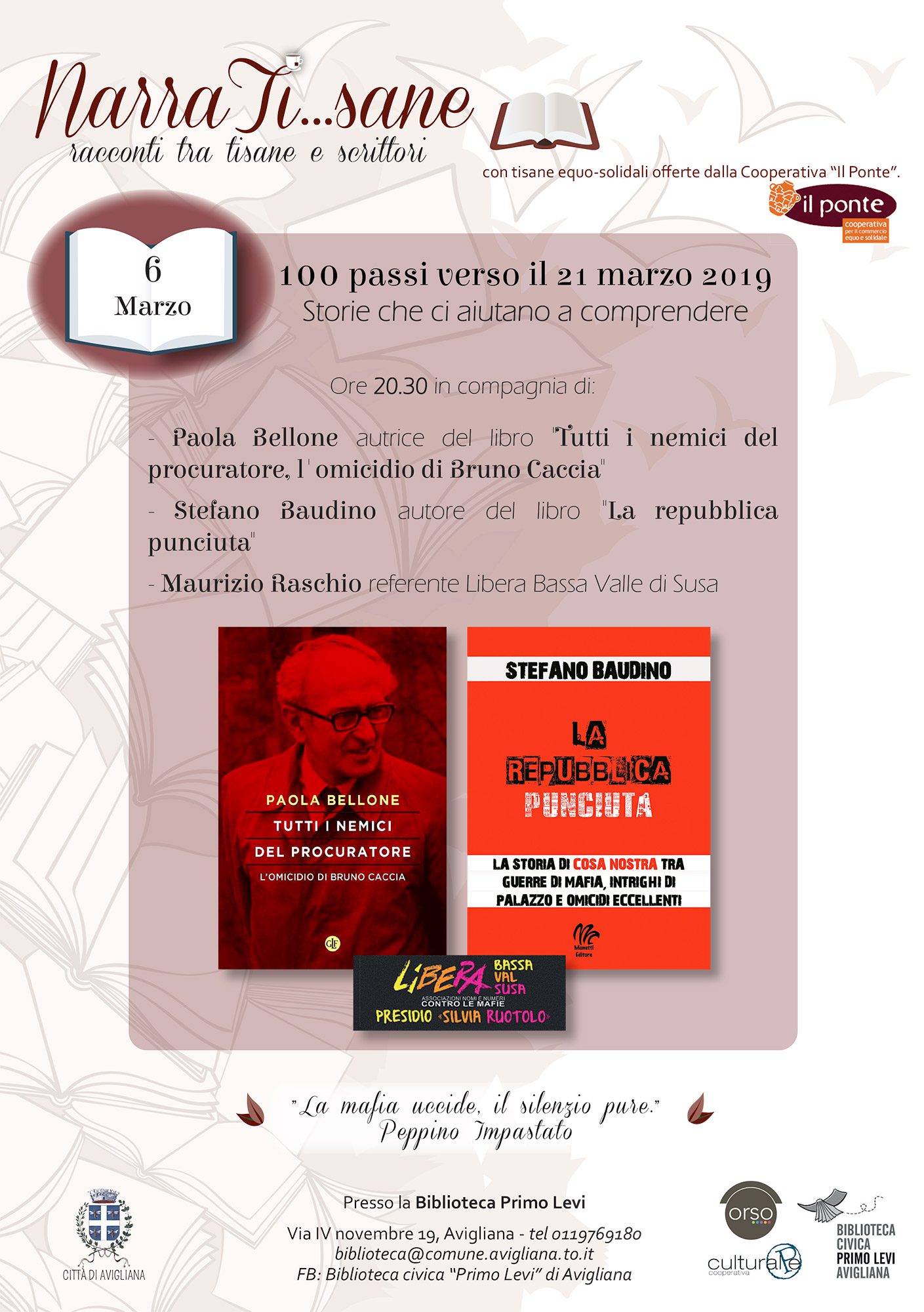 A partire dalle 20,30 di mercoledì 6 marzo 2019 in biblioteca, Paola Bellone presenta il suo “Tutti i nemici del procuratore – L’omicidio di Bruno Caccia” e Stefano Baudino e il suo “La repubblica punciuta – La storia di Cosa nostra tra guerre di mafia, intrighi di palazzo e omicidi eccellenti”. Introduce gli autori Maurizio Raschio, referente presidio Libera bassa Valsusa.