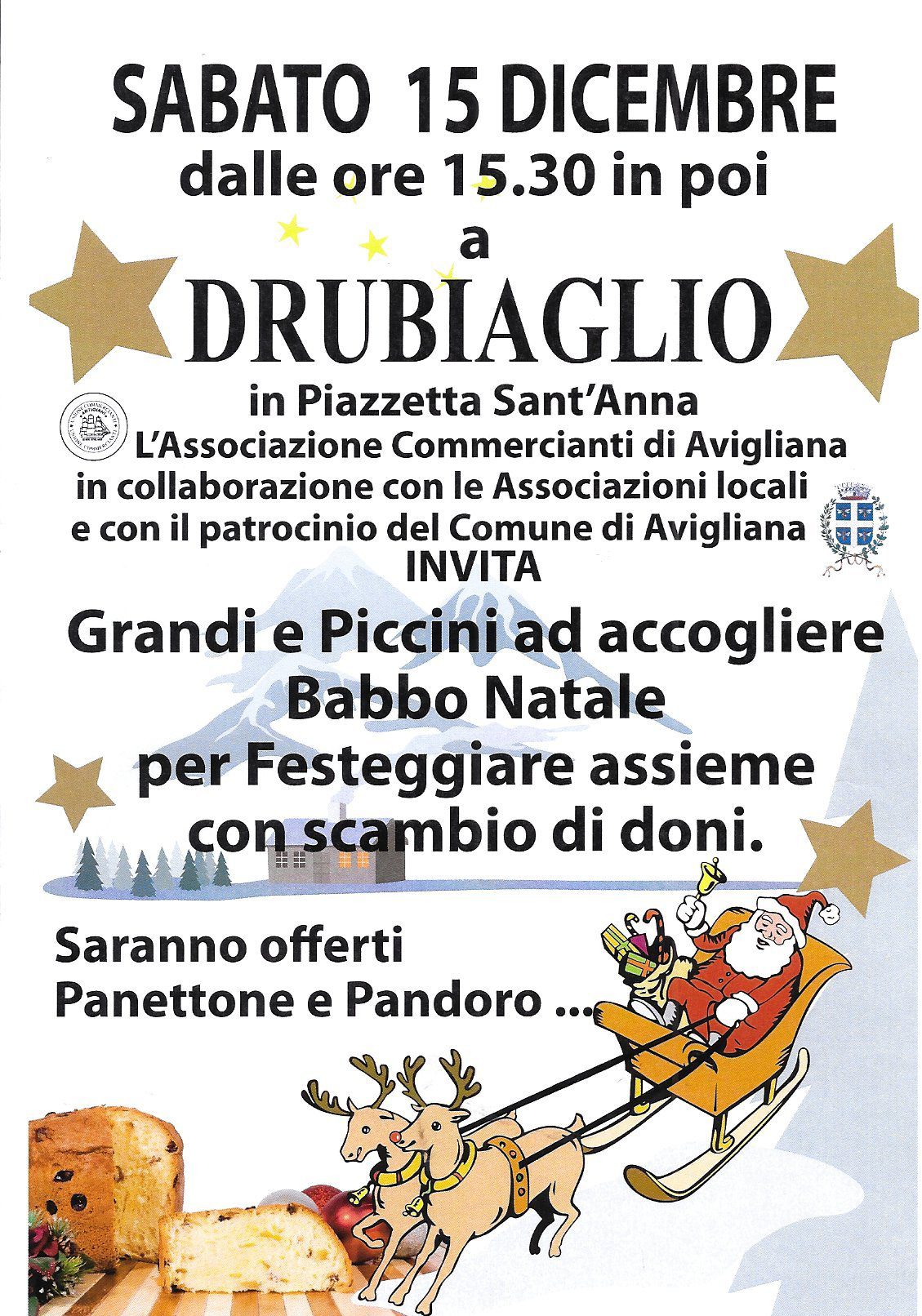 Panettone e pandoro per tutti in piazzetta Sant’Anna a Drubiaglio, sabato 15 a partire dalle ore 15,30 in poi. L’Associazione commercianti di Avigliana in collaborazione con le associazioni locali invita grandi e piccini ad accogliere Babbo Natale per festeggiare lo scambio di doni.