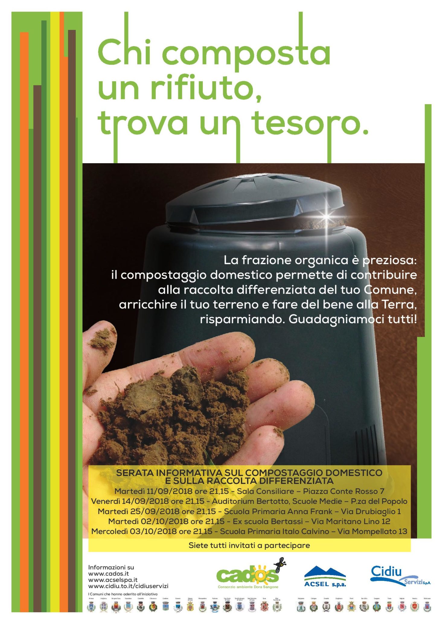 Carissimi concittadini,a fine 2017 la Regione Piemonte ha introdotto importantissime novità sulla pratica del compostaggio domestico, permettendo di conteggiare le quantità che derivano da questa pratica nella raccolta differenziata, fino ad un limite massimo di 120 kg/ab/anno. In tutta la zona Ovest di Torino (prima cintura e Valle di Susa) il consorzio Cados per la raccolta rifiuti, in collaborazione con i due gestori che operano sul territorio, ha elaborato e proposto un progetto unitario per regolare e incrementare la pratica dell’autocompostaggio così da adeguarla a quanto previsto dalla Regione.