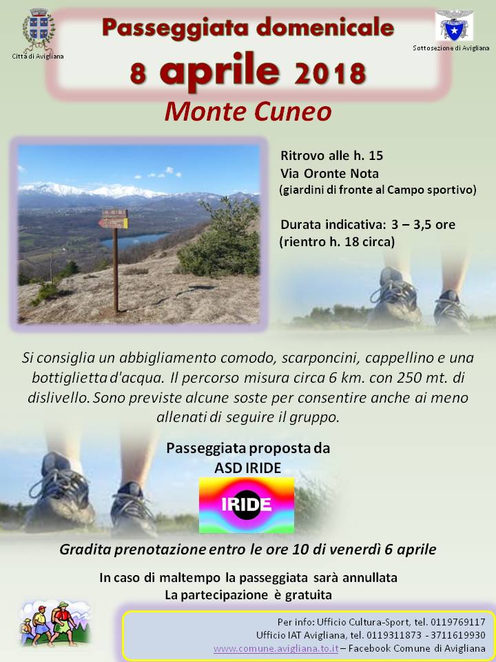 Ritrovo domenica 8 aprile 2018 alle ore 15 in via Oronte Nota (giardini di fronte al campo sportivo), per una passeggiata di circa 3 ore verso il Monte Cuneo. Maggiori informazioni sul volantino.