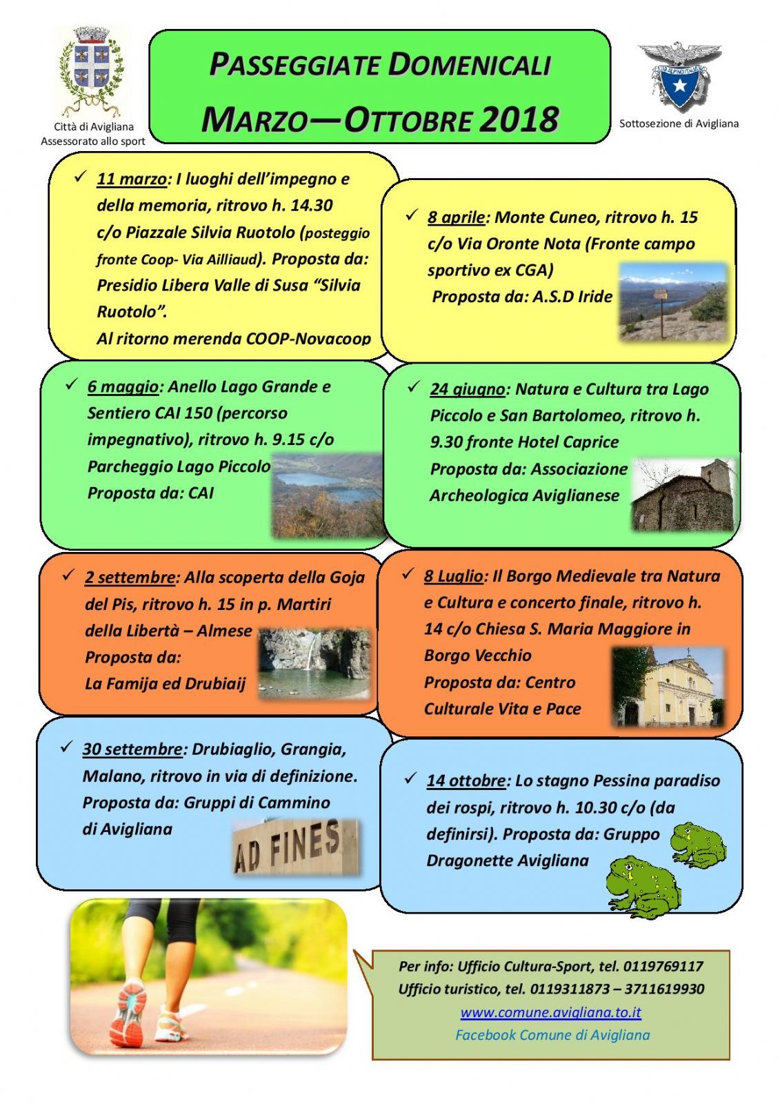 Organizzate dall’assessorato allo Sport in collaborazione con la Sottosezione Cai di Avigliana, con il patrocinio del Comune di Avigliana, ecco l’edizione 2018 delle Passeggiate domenicali, che si svolgeranno da marzo a ottobre 2018 sul territorio. Un appuntamento tradizionale per chi ama camminare immerso nella natura e nel patrimonio storico-culturale di Avigliana e dintorni.