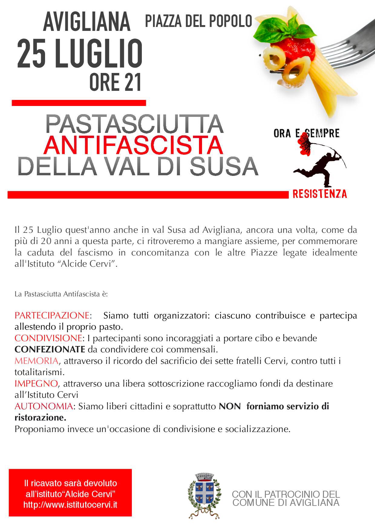 L’edizione 2019 della Pastasciutta resistente della Val di Susa si svolge ad Avigliana. Ancora una volta come da più di 20 anni a questa parte i partecipanti si ritroveranno a mangiare insieme per commemorare la caduta del fascismo in concomitanza con le altre piazze legate idealmente all’Istituto Alcide Cervi a cui sarà devoluto il ricavato.
