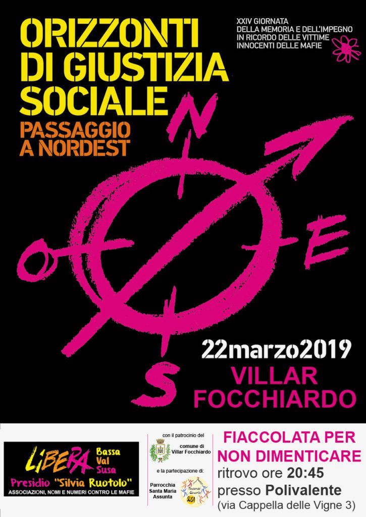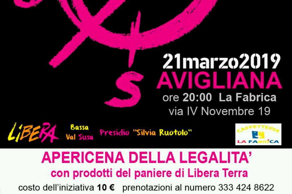 Tra le iniziative locali, in serata “Apericena della legalità – con prodotti del paniere di Libera Terra” presso la Fabrica in via IV Novembre 19 ad Avigliana. Il costo è di 10 euro. Il 22 marzo a Villar Focchiardo è prevista la “Fiaccolata per non dimenticare”. Appuntamento alle 20,45 al Polivalente di via Cappella delle vigne 3. Entrambi gli eventi sono organizzati da Libera Bassa Val Susa, presidio Silvia Ruotolo.