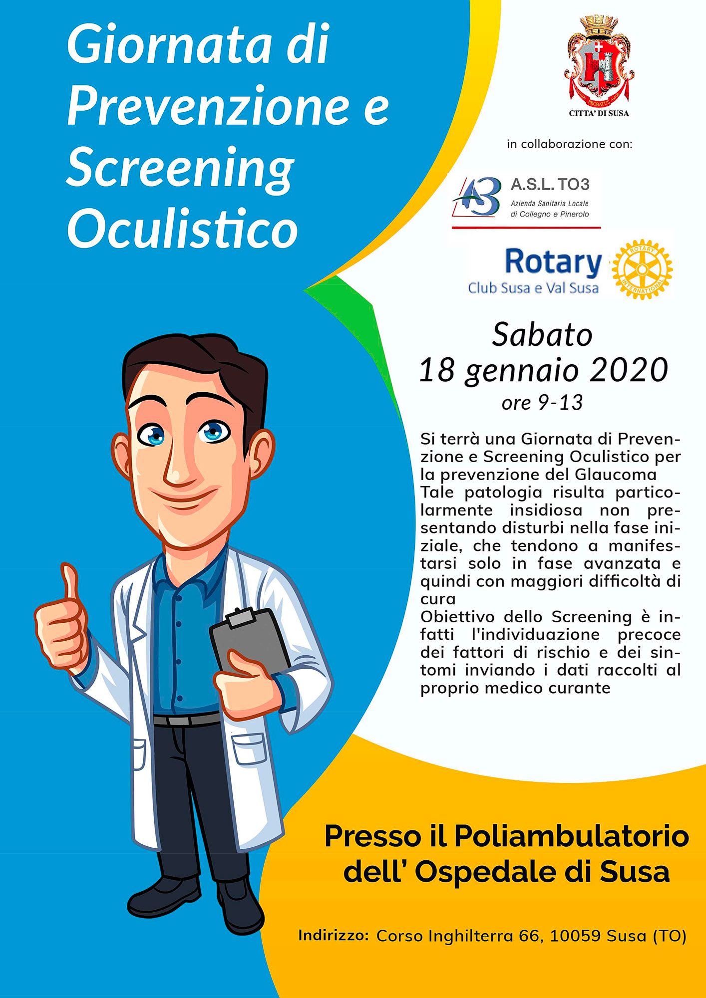 Sabato 18 gennaio dalle 9 alle 13, si terrà presso i locali del poliambulatorio dell’ospedale di Susa, una Giornata di prevenzione e screening oculistico rivolta all’individuazione precoce di una importante patologia che può colpire gli occhi: il glaucoma