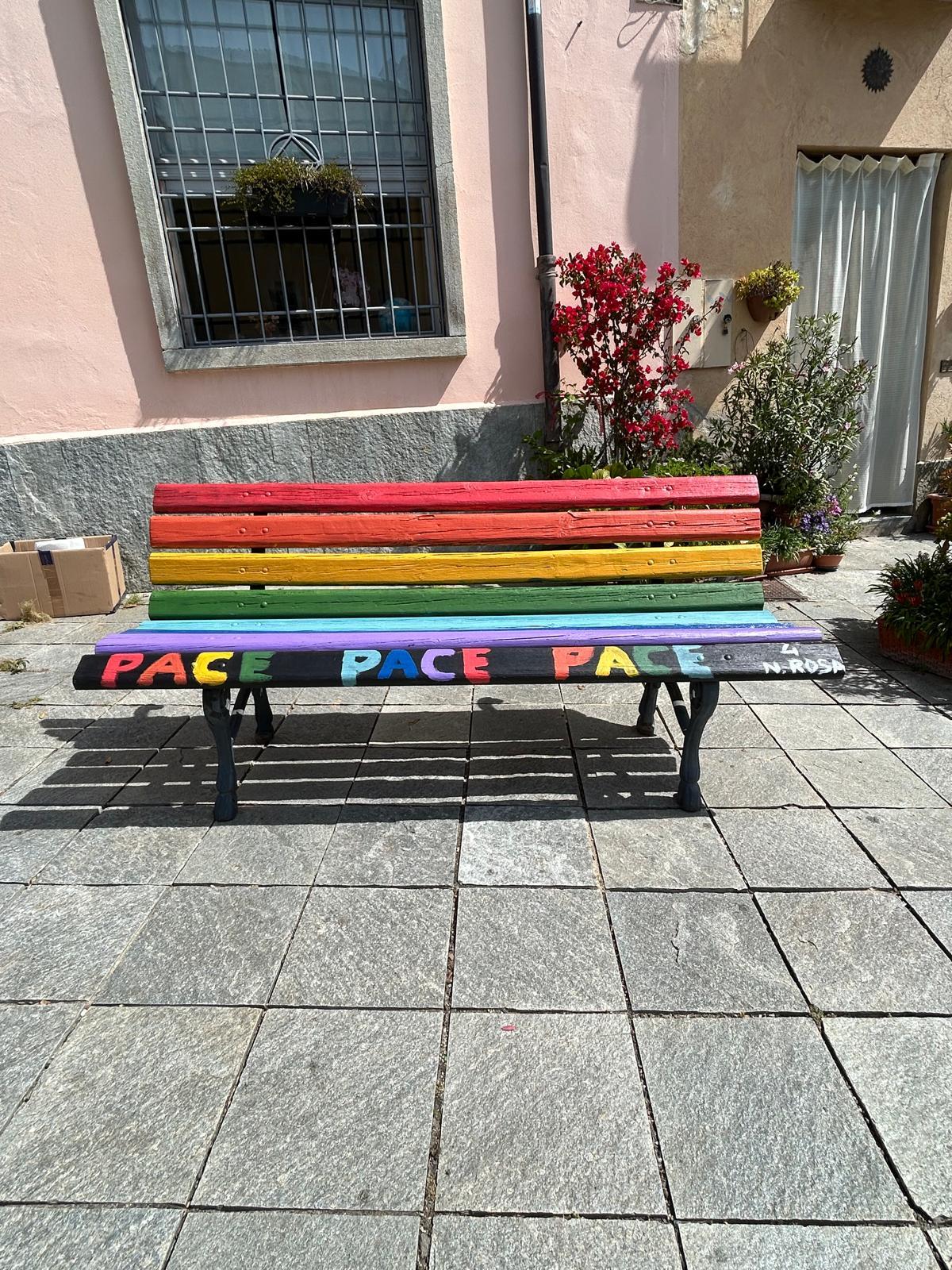 In piazza Conte Rosso è stata realizzata una panchina della pace, mai come in questo periodo fortemente simbolica. «L’idea – spiega l’assessora all’Istruzione Paola Babbini – è nata dalla richiesta dell’ostello Casa Conte Rosso all’Amministrazione di verniciare una panchina. Da qui la proposta di realizzare un simbolo di pace che la classe IV della Norberto Rosa ha subito raccolto, eseguendo in occasione dell’inaugurazione un piccolo canto sul tema della pace».