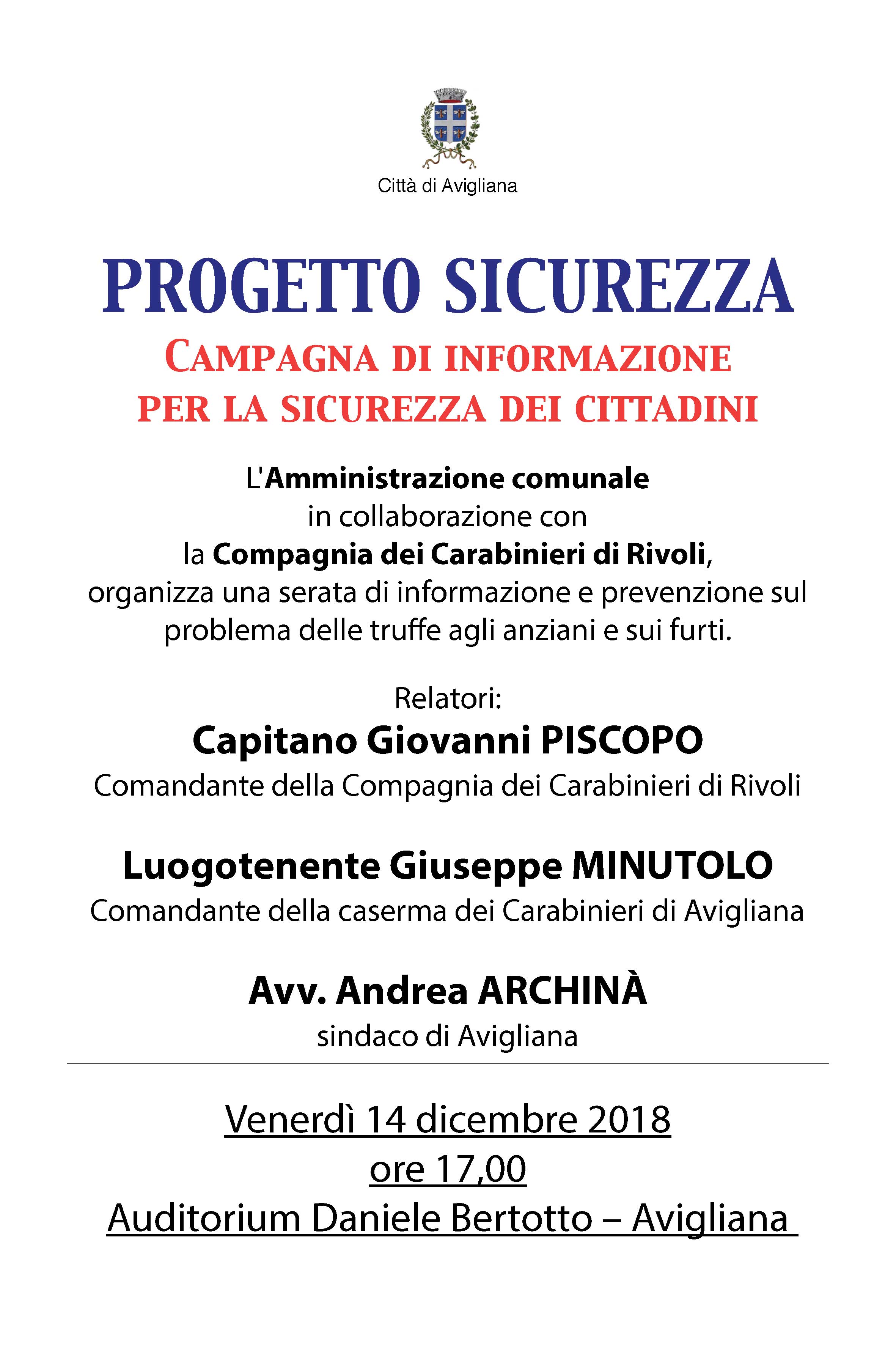 Incontro sulla sicurezza e la prevenzione delle truffe e dei furti agli anziani in collaborazione con la Compagnia dei Carabinieri di Rivoli il 14 dicembre alle ore 17 presso l’Auditorium Bertotto  Il 14 dicembre 2018 alle 17 presso l’Auditorium Daniele Bertotto di Avigliana, si svolge un incontro di informazione e prevenzione sul problema delle truffe agli anziani e sui furti, organizzato dall’Amministrazione comunale di Avigliana in collaborazione con la Compagnia dei Carabinieri di Rivoli. I relatori sono il Capitano Giovanni Piscopo, Comandante della Compagnia dei Carabinieri di Rivoli, il Luogotenente Giuseppe Minutolo, Comandante della caserma dei Carabinieri di Avigliana e Andrea Archinà, sindaco di Avigliana.