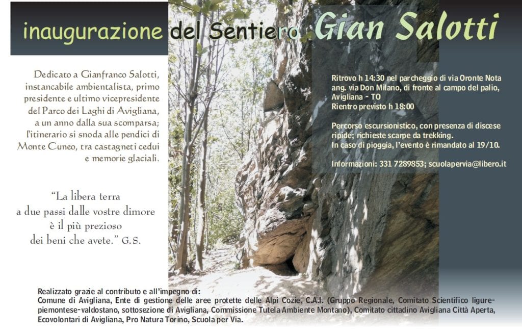 La locandina di inaugurazione del sentiero dedicato a Gianfranco Salotti, primo presidente del Parco dei Laghi di Avigliana, avvenuta un anno dopo la sua scomparsa, il 12 ottobre 2013