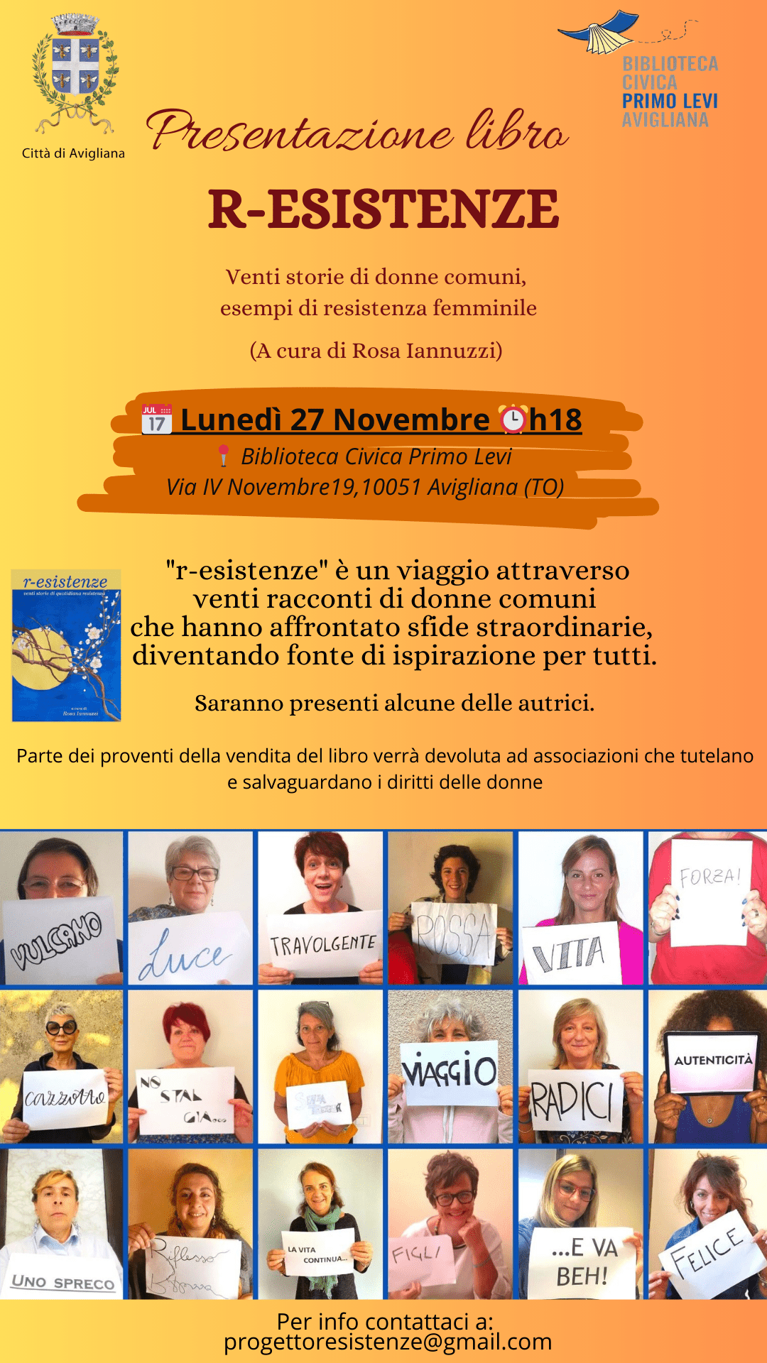 Avigliana, 13 novembre 2023 – Dopo un itinerario di 23 presentazioni in tutta Italia e altre tre previste nel mese di novembre, il progetto R-esistenze sbarca alla biblioteca civica Primo Levi lunedì 27 novembre alle 18, dopo due presentazioni a Roma, di cui una all’Università la Sapienza, 8 a Torino e provincia, 4 in Umbria, 4 in Toscana e 5 in Calabria. R-esistenze è un libro a cura di Rosa Iannuzzi, ma è anche un viaggio attraverso venti racconti di donne comuni, esempi di resistenza femminile, che hanno affrontato sfide straordinarie, diventando fonte di ispirazione. Saranno presenti alcune delle autrici. Le presentazioni si sono svolte in biblioteche, case del quartiere, circoli Arci, musei, sale comunali, locali, librerie, in collaborazione con associazioni culturali, Unitre. Parte dei proventi della vendita del libro sarà devoluta ad associazioni che tutelano e salvaguardano i diritti delle donne.