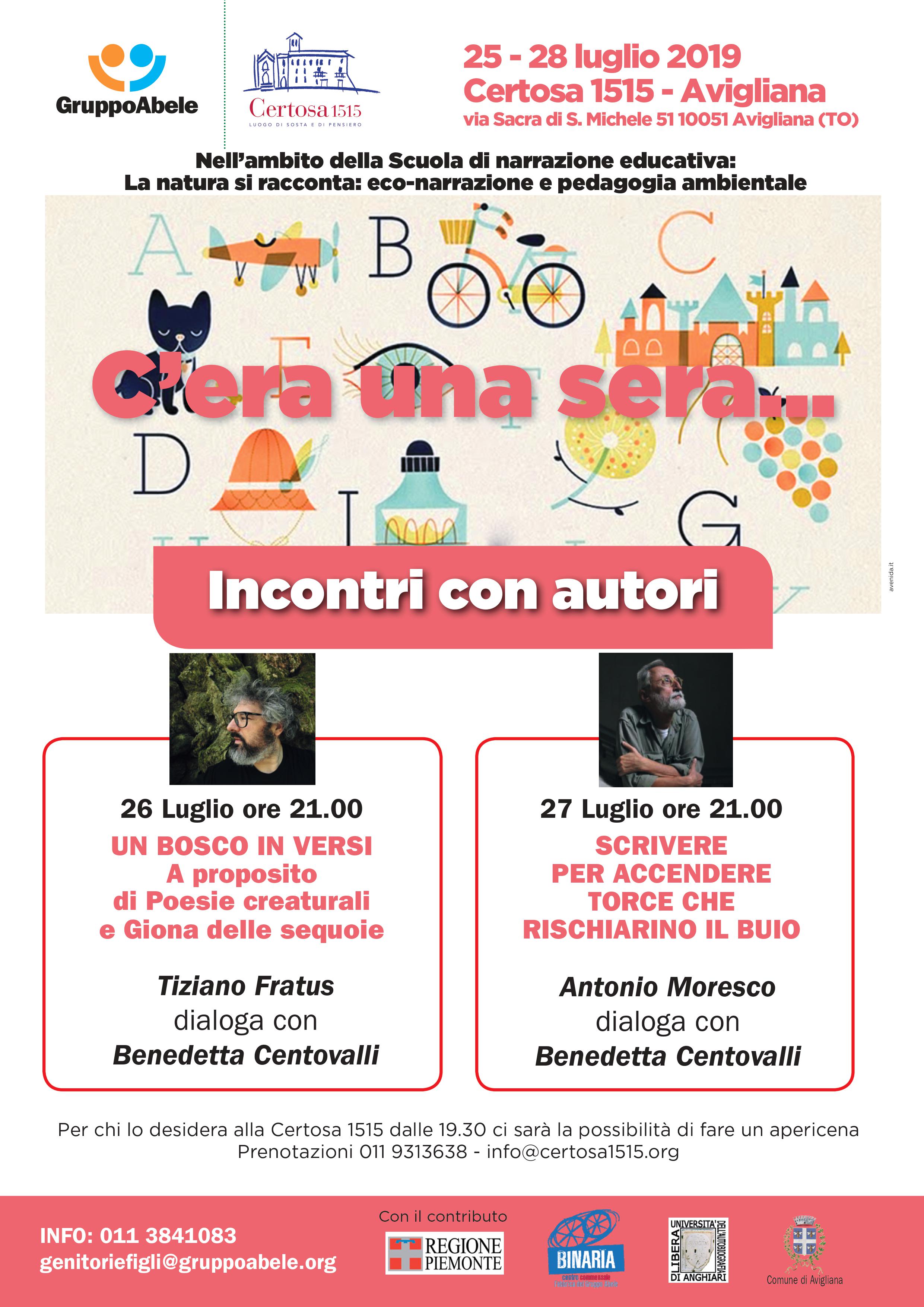 Sono previste due serata aperte al pubblico di incontro con autori che attraverso opere di poesia e di narrazione si occupano di tematiche ambientali: il 26 luglio con Tiziano Fratus ed il 27 luglio con Antonio Moresco.