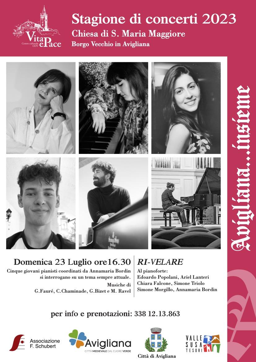 Prosegue la Stagione “Avigliana … Insieme” 2023 dell’associazione Vita e Pace con il patrocinio del Comune di Avigliana. Domenica 23 luglio 2023 alle 16,30 nella Chiesa di Santa Maria Maggiore si terrà il concerto di 5 giovani pianisti partecipanti al progetto Ri-velare. I musicisti fanno parte di due classi di pianoforte, una del Conservatorio Paganini di Genova, e una del Conservatorio Verdi di Torino. L’incontro all’interno di un progetto crea uno spazio fisico e temporale in cui esperienze, competenze, curricula, età e profili personali molto diversi collaborano per creare un messaggio musicale, il frutto di un percorso condotto insieme. Ariel Lanteri è una studentessa del corso di didattica strumentale del Conservatorio di Torino, pianista classica e cantante jazz, musicista poliedrica ed entusiasta. Edoardo Popolani è un allievo del corso propedeutico di pianoforte, con uno spiccato talento per la composizione, mentre Chiara Falcone è al termine dei suoi studi di pianoforte e prossima al diploma accademico di secondo livello. Chiara, come Simone Triolo è siciliana, ma Simone ha appena iniziato il biennio al Conservatorio di Torino, dopo aver studiato al Conservatorio di Catania. Simone Morgillo, musicista e navigatore, ha concluso i suoi studi pianistici al Conservatorio di Genova e sta ora frequentando un corso di perfezionamento con Massimiliano Damerini all’accademia di Pinerolo. Coordina Anna Maria Bordin, unica testimone di tutte le storie didattiche e dei percorsi pianistici.
