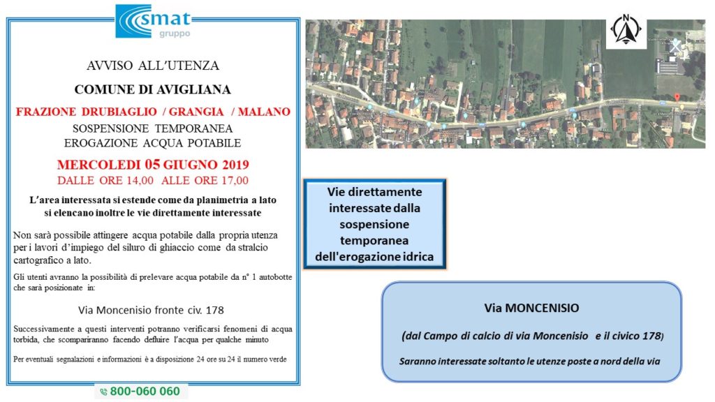 A causa di questi interventi non è stato pertanto possibile attingere acqua potabile dalla propria utenza. Gli utenti, come da avviso affisso in tutte le zone interessate, hanno avuto la possibilità di prelevare acqua potabile da n° 4 autobotti, posizionate rispettivamente in: via Moncenisio angolo via Musinè, via Almese fronte Civico 72, via Drubiaglio angolo via Moncenisio (scuole Anna Frank), piazza Sant’Anna.