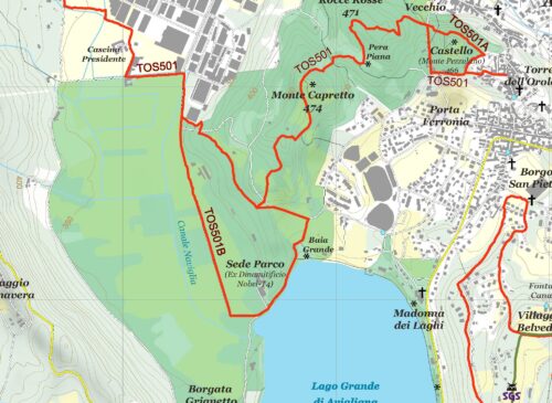 Il sentiero TOS501 parte da piazza Conte Rosso, sale per via Montenero e via Norberto Rosa alla rotonda del Castello, scende in via Piave, sale in via Ortigara e arriva al Culaté. Lì si unisce al TOS501A (variante del Castello, Eea). Poi si prosegue per le Rocce Rosse, Pietra Piana (brevissima digressione) passando poco prima a poca distanza dal monolito Roc ‘d Pera Piana, Monte Capretto, Pilone di Benna Audera, si svolta a destra per raggiungere la Palude dei Mareschi (angolo via Monte Capretto). Qui a sinistra parte la variante TOS501B che raggiunge la Sede del Parco, sale per via Monte Pirchiriano sino a poco prima della porta Sud d’ingresso del Parco (via Pontetto), si svolta a sinistra sulla sterrata che porta al pilone e si ritorna a dove inizia via Monte Capretto.