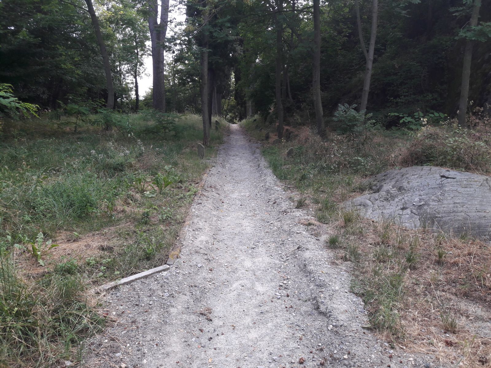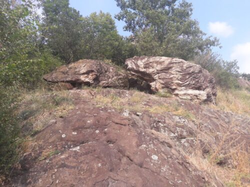 Il sentiero continua con saliscendi in cui si trovano uno spiazzo con al centro rocce a vista (si può passare sia a destra che a sinistra), una grande roccia sporgente che bisogna superare inchinandosi e infine una salita con gradini che porta alla metà della collina. Alla fine di questa salita si incontra sulla destra un piccolo sentiero che si sposta dalla stradina principale e porta ad una seconda panoramica sul Lago Grande e qui c’è una bella sorpresa: su una roccia soprastante la panoramica ci sono due rocce gemelle scolpite dal ghiacciaio, che hanno la forma di tartaruga.