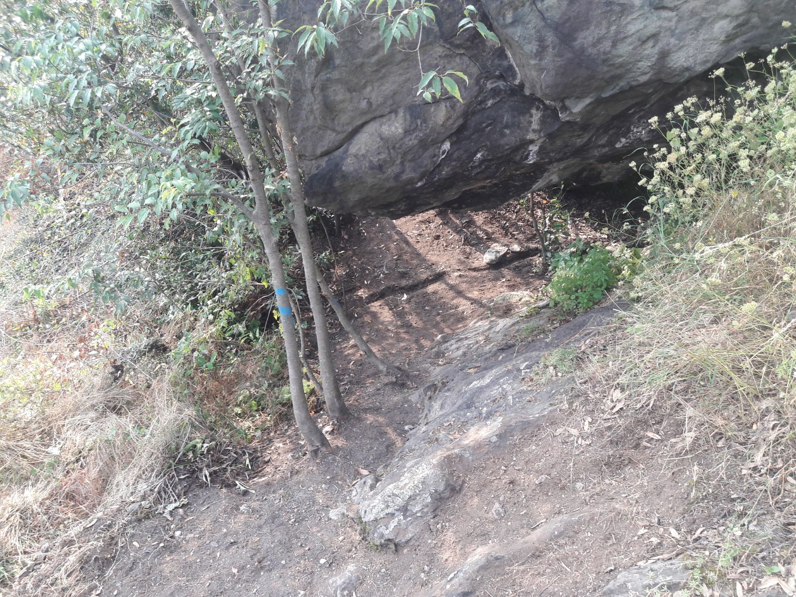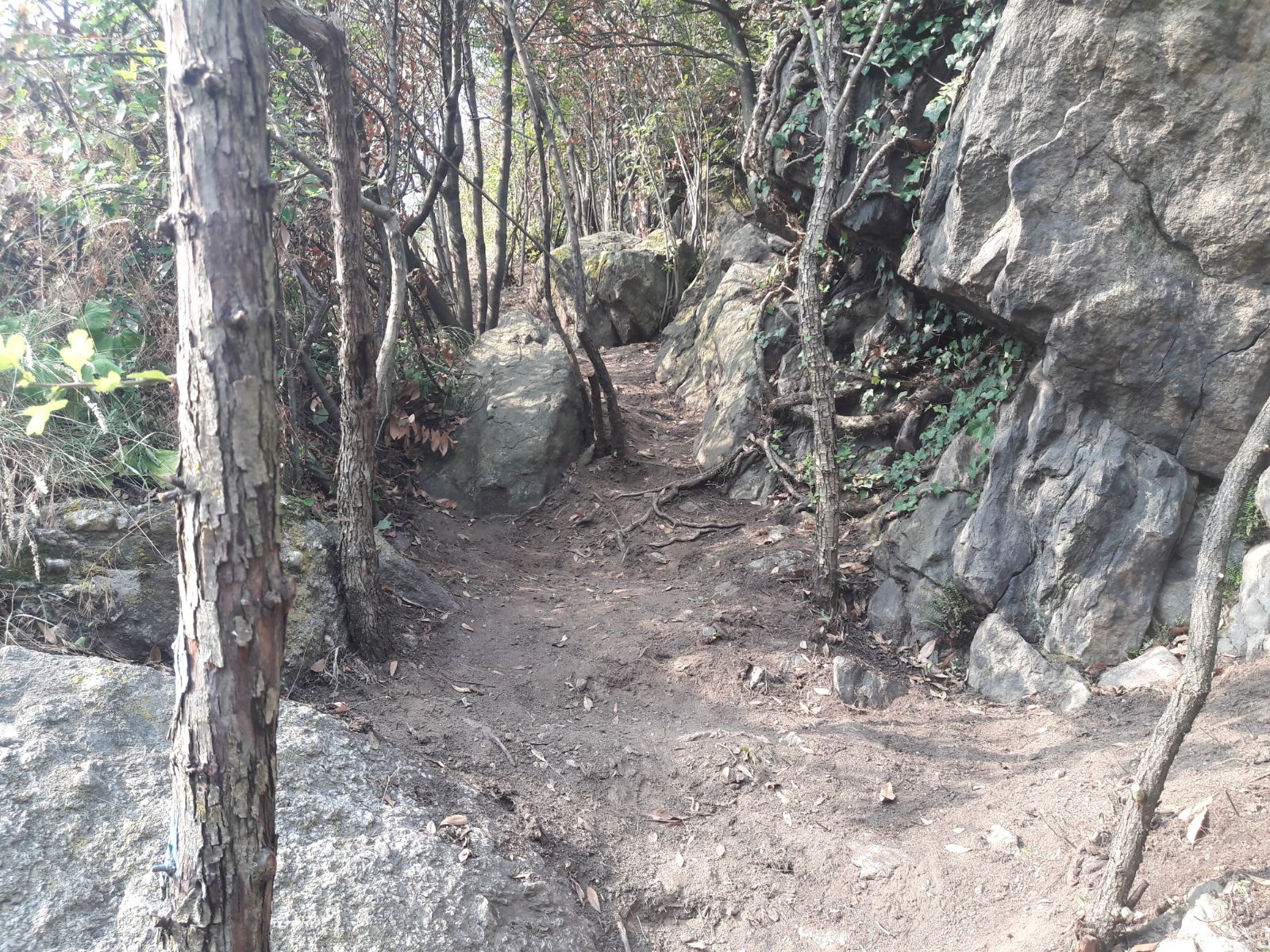 Ritornando sul sentiero principale si arriva a una spaccatura sulla roccia che bisogna superare con prudenza, ma molto particolare: qualcuno ha messo una corda da scalatori per potersi tenere. Bisognerà prevedere la messa in opera di una corda d’acciaio per essere più sicuri. Il sentiero a questo punto si inoltra con alcuni saliscendi fino alla via che scende dal Castello e porta con una scala ferrata alle Rocce Rosse. Pertanto prendendo sulla destra di tale sentiero si arriva al Castello. La passeggiata che dura circa 20 minuti.