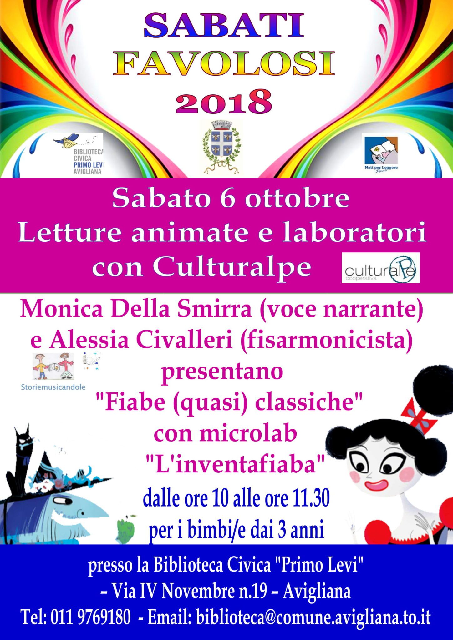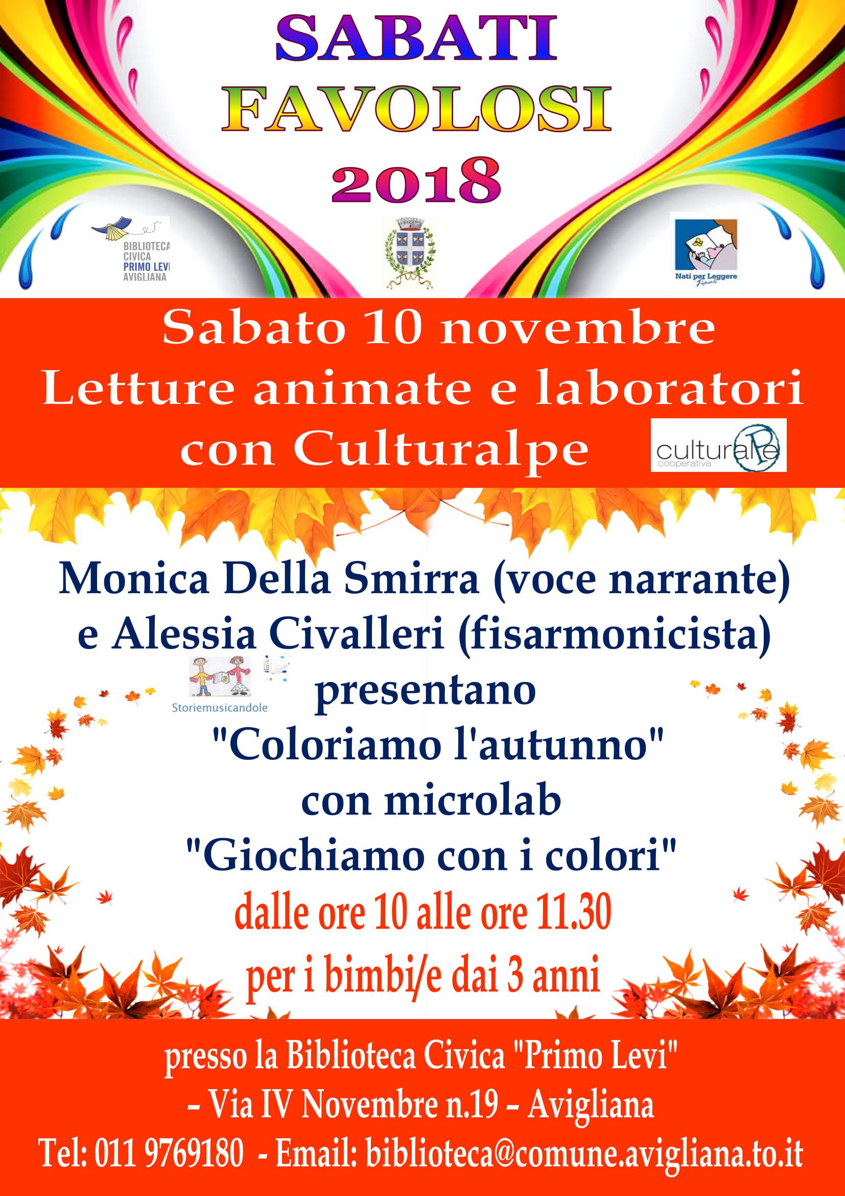Sabato 10 novembre 2018 continuano gli appuntamenti dei Sabati favolosi presso la biblioteca civica Primo Levi, con le letture animate e i laboratori di Culturalpe. Monica della Smirra, voce narrante e Alessia Civalleri, fisarmonicista presentano: “Coloriamo l’autunno” con il microlab “Giochiamo con i colori”. Dalle ore 10 alle ore 11,30 per i bimbi dai 3 anni in su.