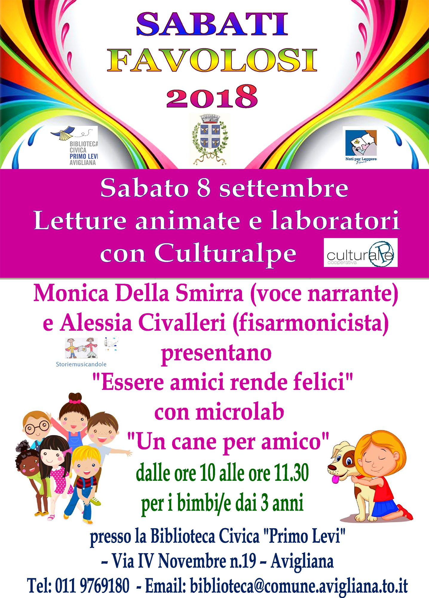 Sabato 8 settembre dalle ore 10 alle ore 11,30, presso la biblioteca Primo Levi di Avigliana, Culturalpe ha proposto invece “Letture animate e laboratori” con Monica Della Smirra voce narrante e Alessia Civalleri alla fisarmonica. Hanno presentato “Essere amici rende felici” con microlab “Un cane per amico”.