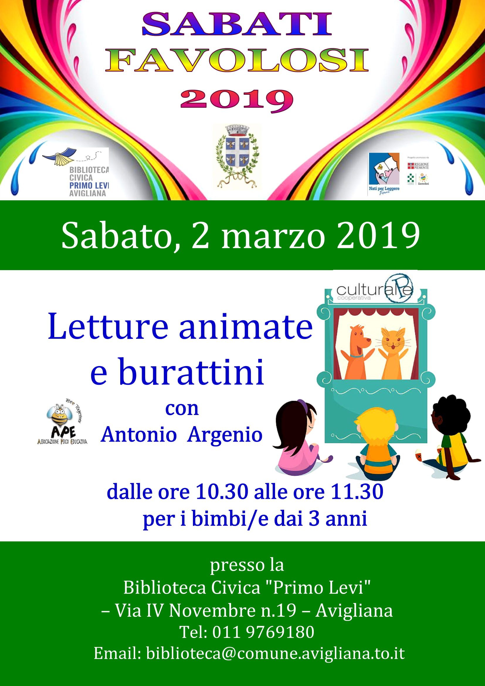 Sabato 2 marzo 2019 per la rassegna “Sabati favolosi” alla biblioteca civica Primo Levi di Avigliana, letture animate e burattini con Antonio Argenio dalle ore 10,30 per le bimbe e i bimbi dai 3 anni in su.
