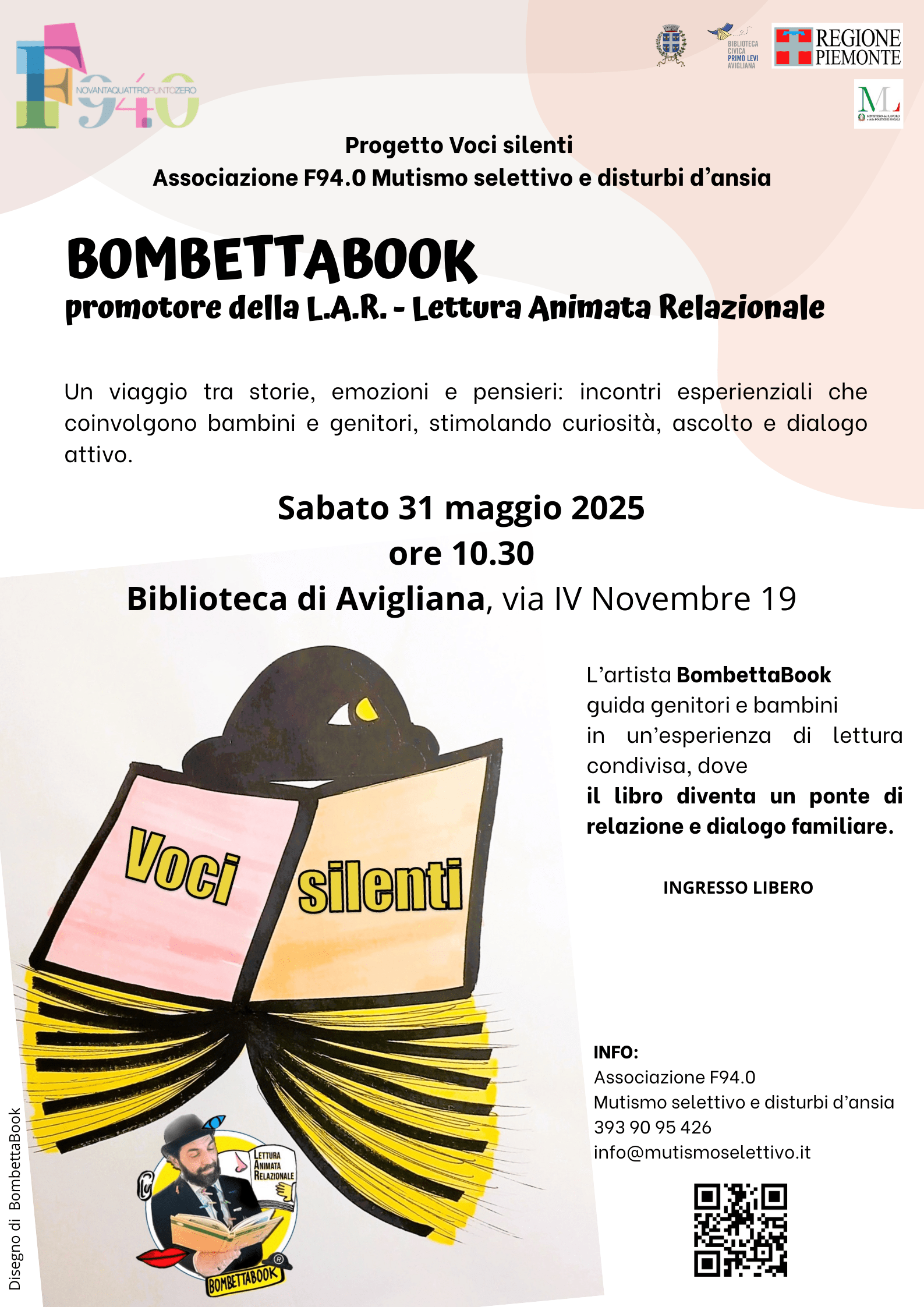 Avigliana, 27 maggio 2025 – A supporto delle famiglie con bambini affetti da mutismo selettivo e disturbi d’ansia, nell’ambito del progetto Voci silenti, sabato 31 maggio alle 10,30 alla biblioteca civica Primo Levi di Avigliana si svolge un incontro con Bombettabook, promotore della Lettura animata relazionale. L’artista guiderà genitori e bambini in un’esperienza di lettura condivisa dove il libro diventa un ponte di relazione e dialogo familiare