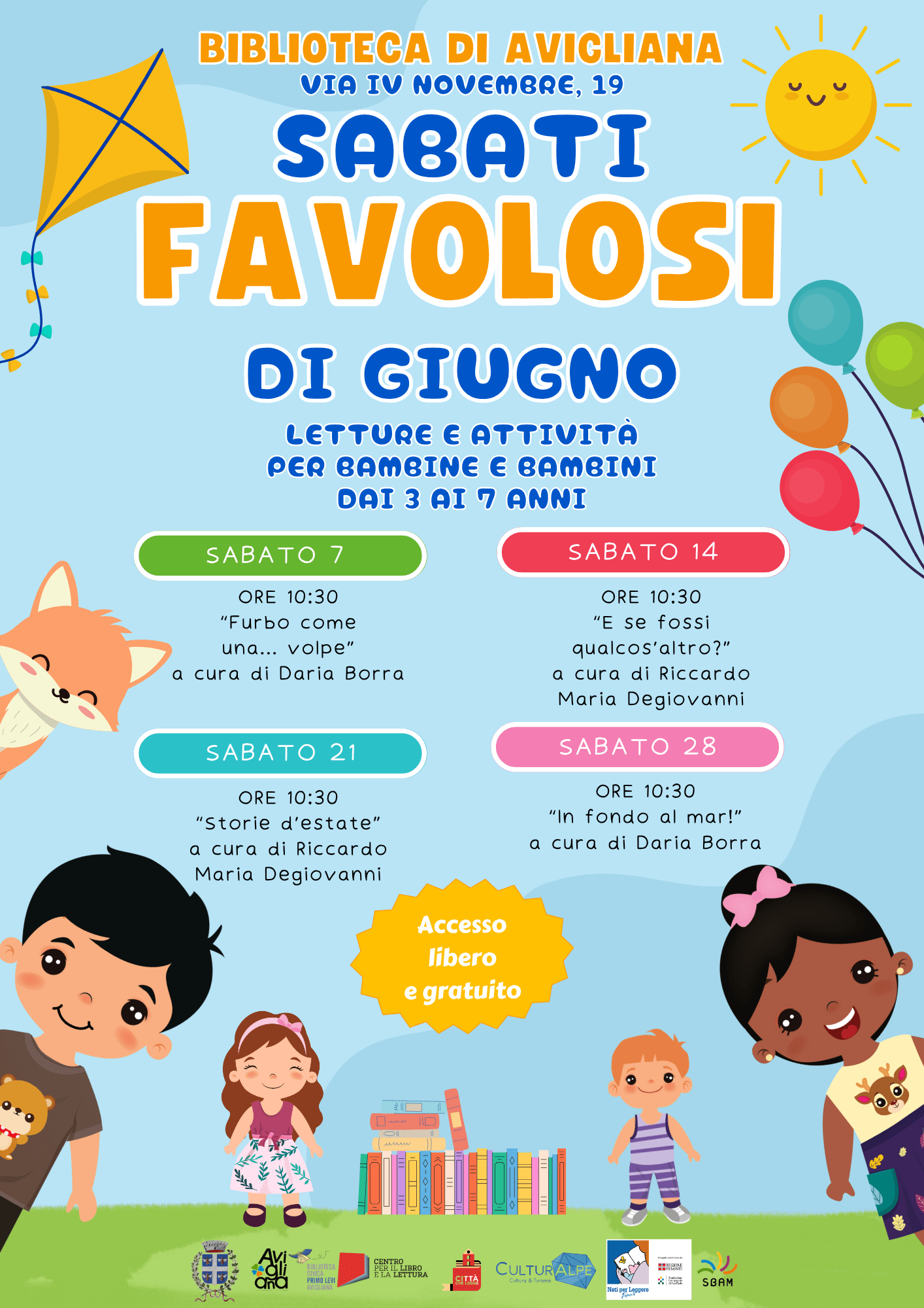 A partire invece da sabato 7 giugno alle 10,30 iniziano i consueti Sabati favolosi con Daria Borra e Riccardo Maria Degiovanni: incontri previsti il 7, il 14, il 21 e il 28 giugno. Accesso libero e gratuito.