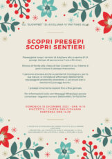 La passeggiata è inoltre un’occasione per scoprire i sentieri del territorio, valorizzati grazie alle cure e alla manutenzione degli Ecovolontari. Sempre domenica 19 si terrà il presepe vivente in piazza Conte Rosso dopo il mercatino di Natale della Proloco con la partecipazione di tutti i borghi cittadini e di alcune associazioni del territorio. Alle 16 è previsto l’arrivo di Babbo Natale in carrozza e alle 17 la musica degli zampognari accompagnerà la rappresentazione del presepe vivente con partenza dal piazzale del Castello alla luce delle fiaccole e arrivo davanti al municipio.