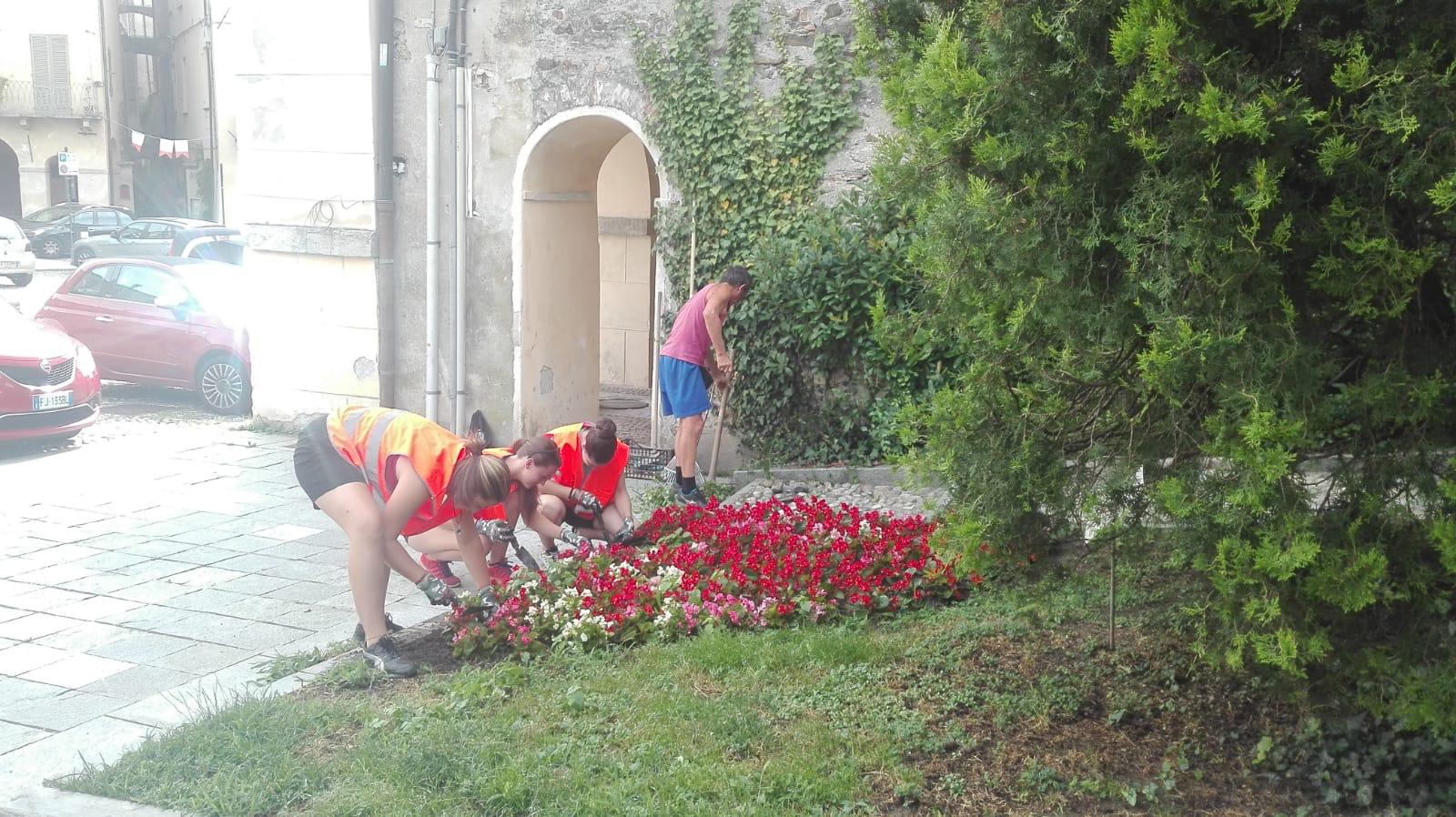 • piazza Conte Rosso: sostituzione e riverniciatura panchine, rimozione delle ragnatele sotto i portici, rimozione delle erbacce nel cortile interno del municipio;