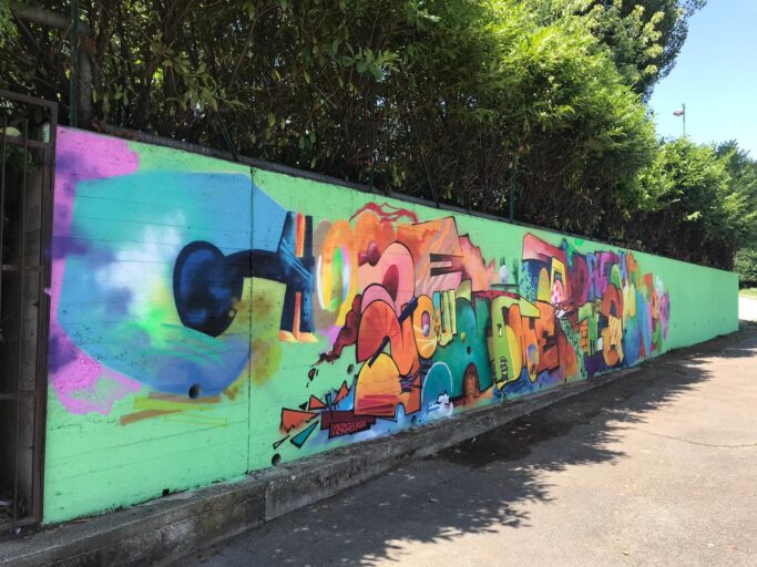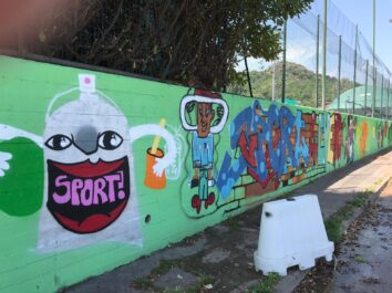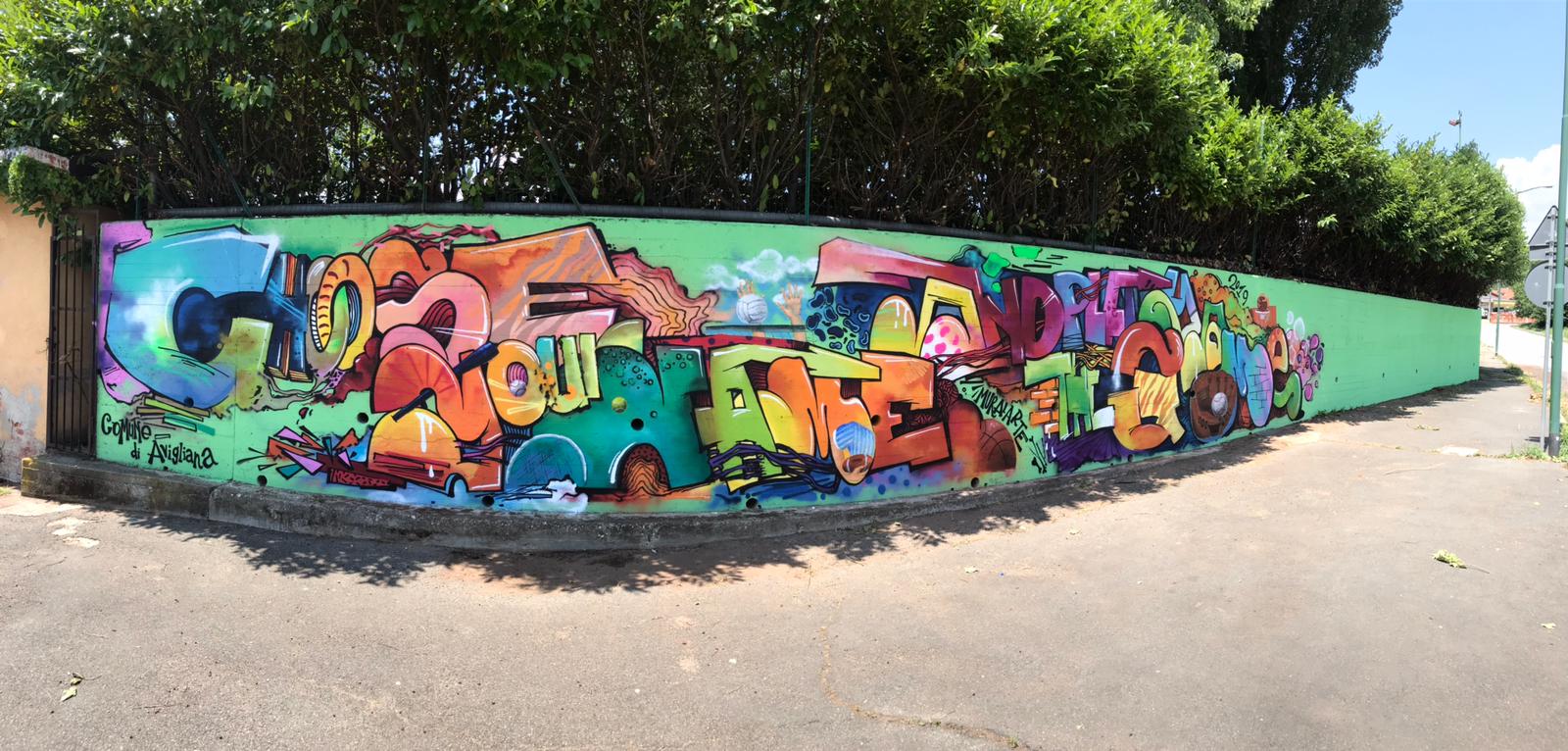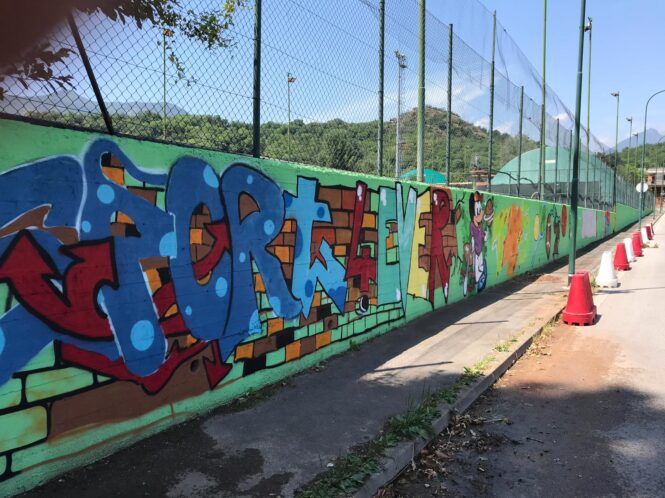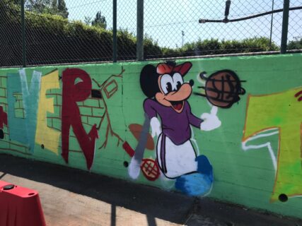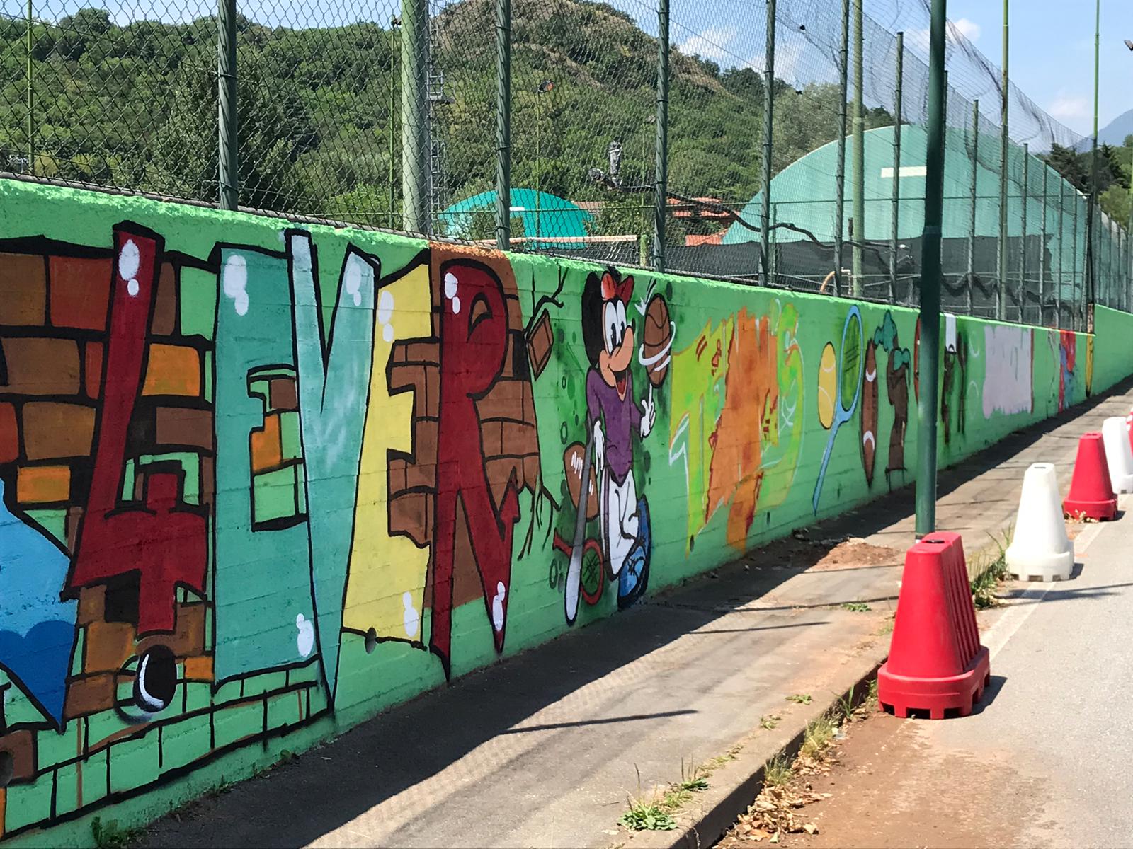 Introduzione alle tecniche e agli stili del writing, realizzazione bozzetti e realizzazione del murales sul muro dei campi da tennis del centro sportivo comunale. Il campo Muralarte è stato coordinato da Ludovico Allasio.