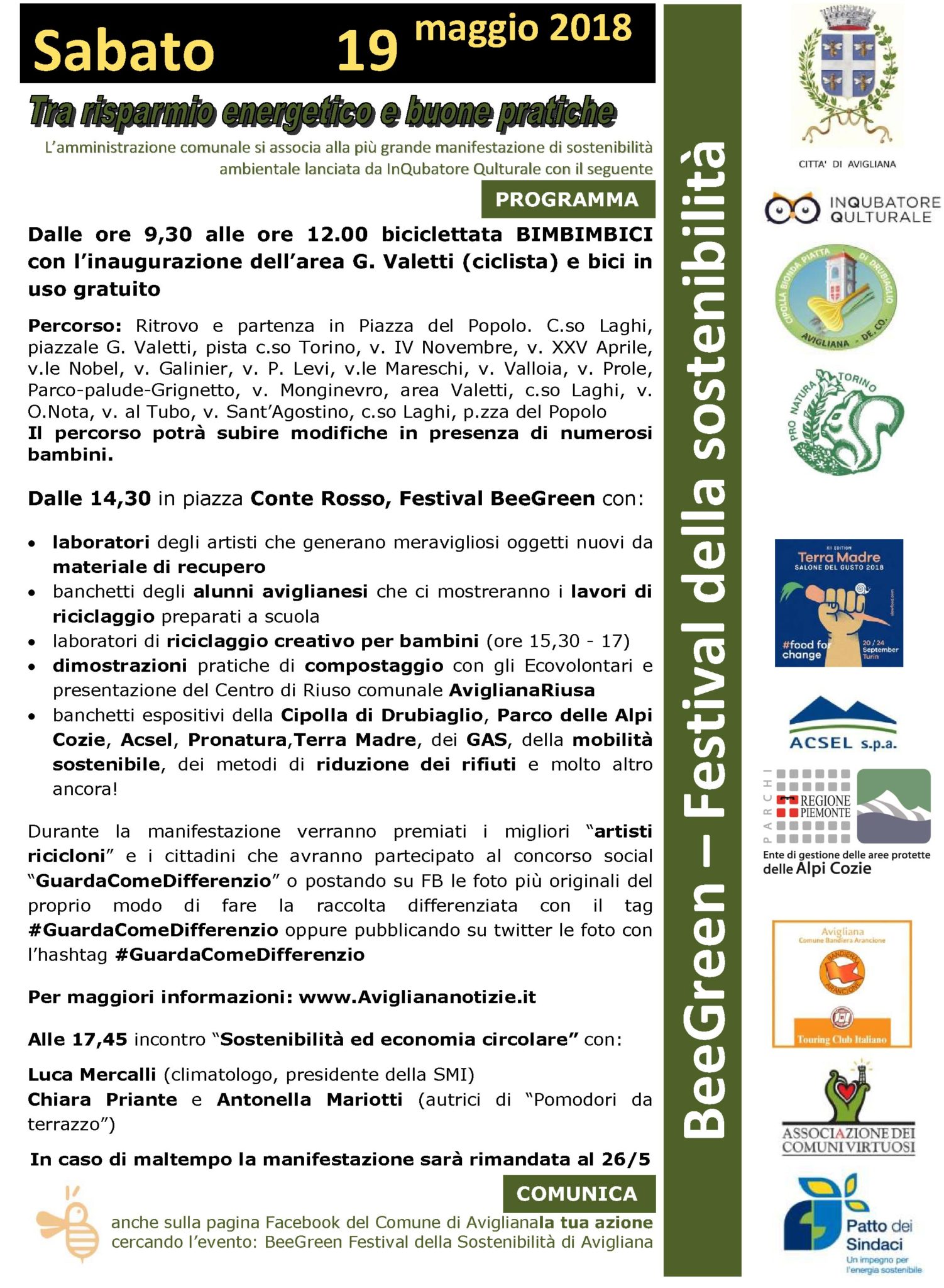 BeeGreen è il primo festival della sostenibilità. Avigliana è uno degli enti pubblici che hanno aderito all’iniziativa attraverso l’assessorato alla Politiche ambientali: il 19 maggio 2018 in piazza Conte Rosso